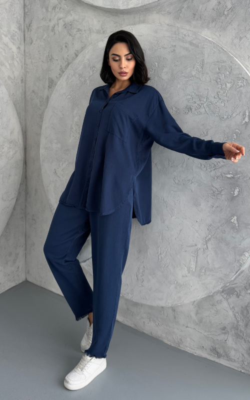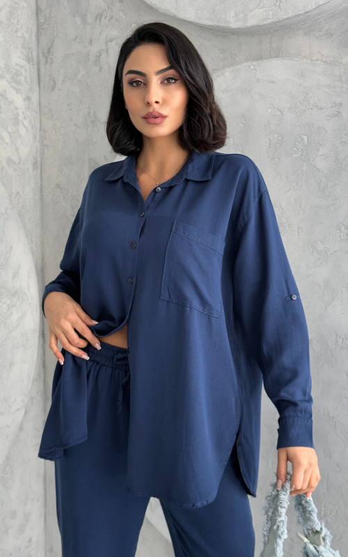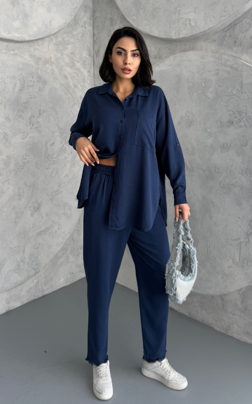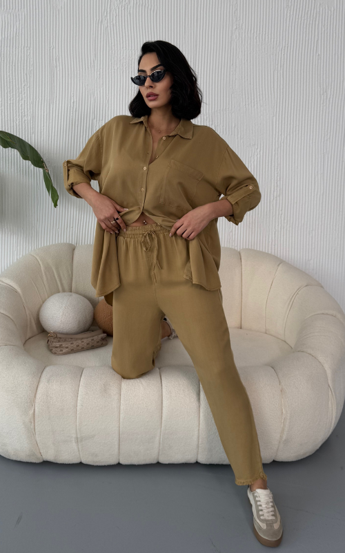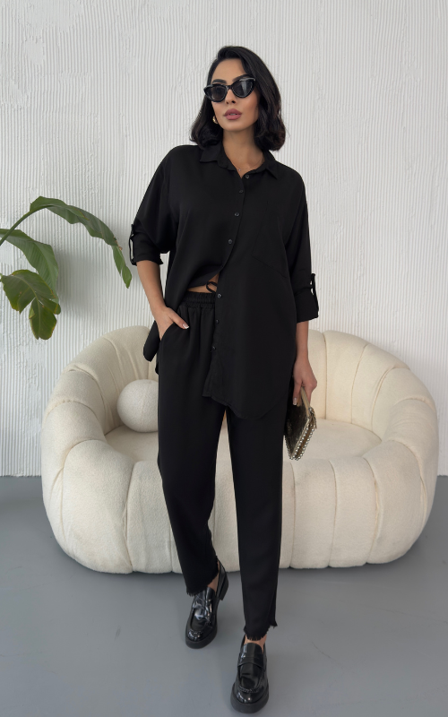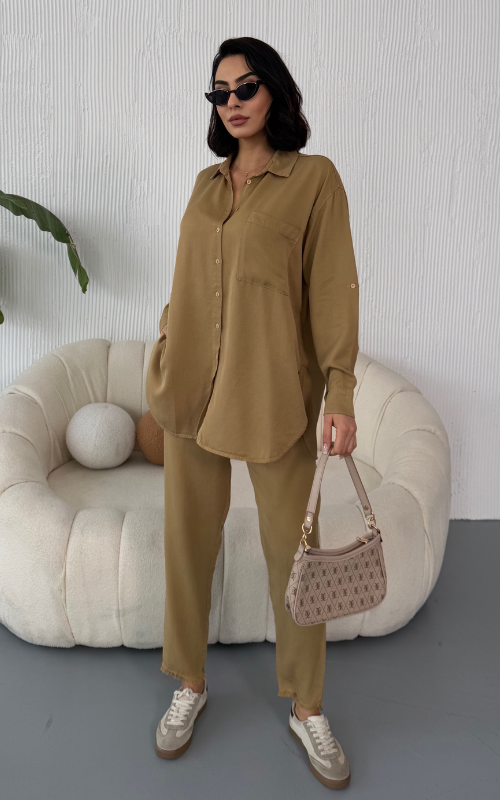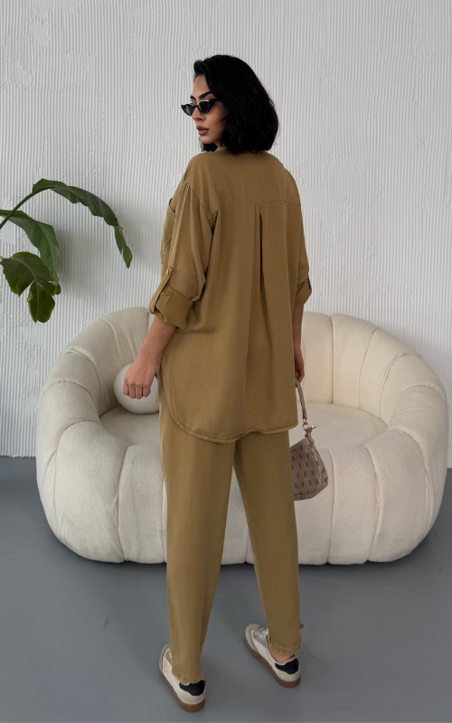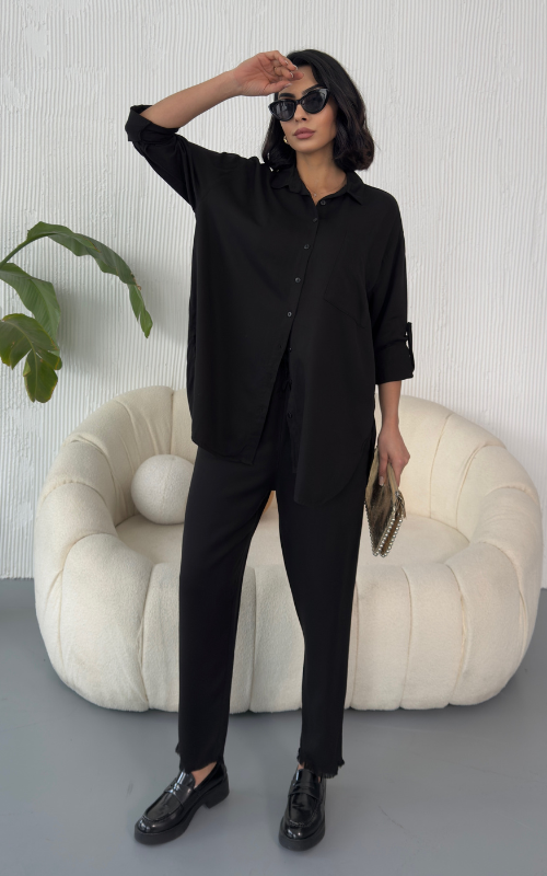 The Aisha Set features a crafted collared top with minimal front buttons and a single pocket on one side, paired with straight-cut pants. Perfect for everyday wear, offering both comfort and a style.