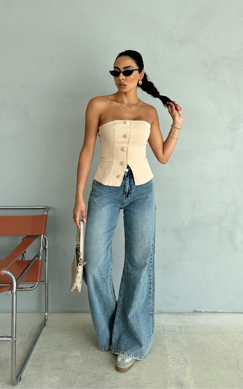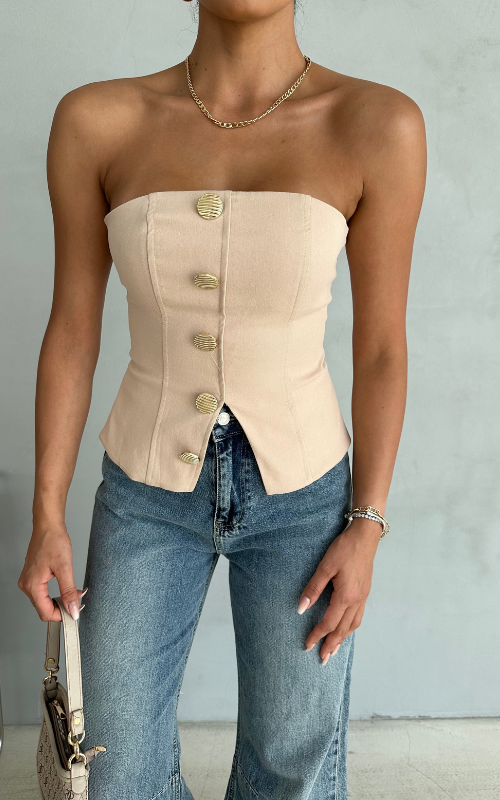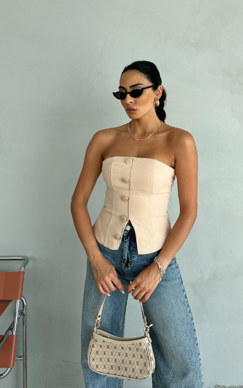 Elevate your style with our Alice Top, a sophisticated strapless top adorned with high-quality buttons, perfectly tailored for you!