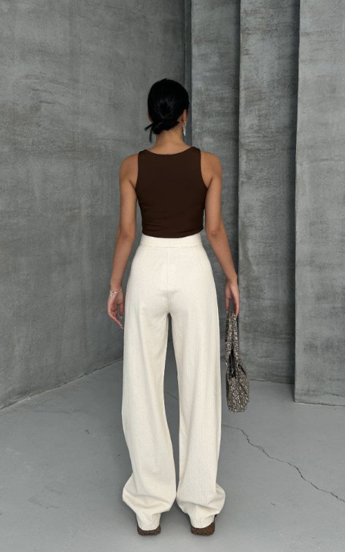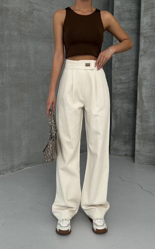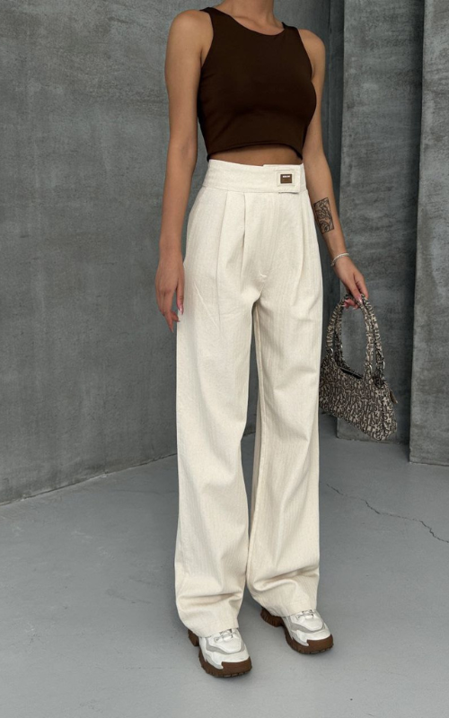 Express your style with our Ally Pants, these high-waisted straight-cut pants feature a subtle vertical texture and a stylish detailed waistband, offering a sleek and refined look.