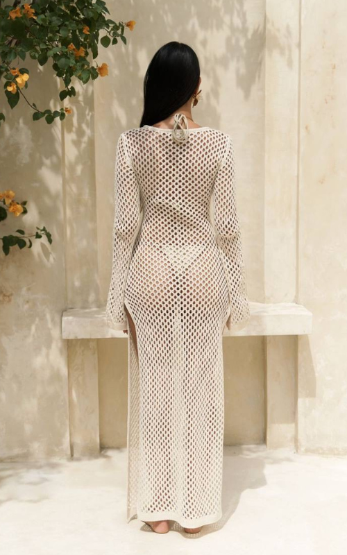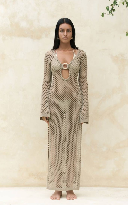 The Ashley Dress is a knit piece with flared sleeves, side slits, and an O-ring detail at the chest. Finished with a rounded V-neckline, it’s perfect for laid-back beach days.