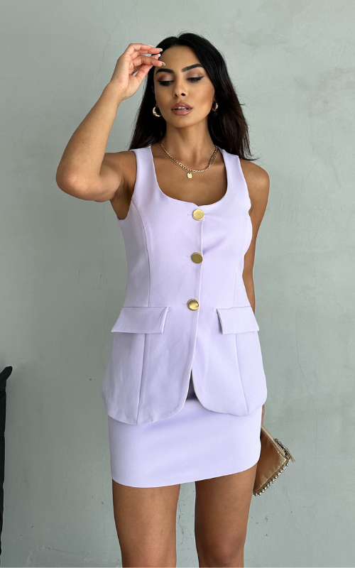 The Ava Gold Button Set includes a chic long vest with striking gold buttons and a matching mini skirt. This stylish ensemble effortlessly combines sophistication and flair, perfect for any occasion.