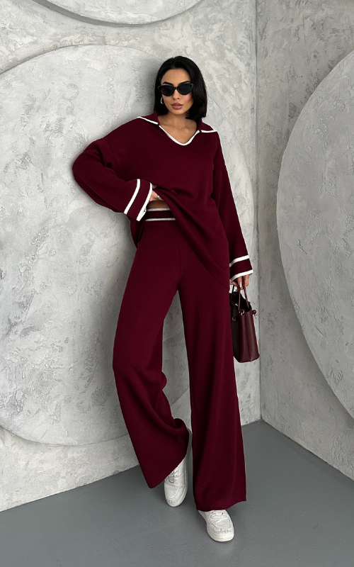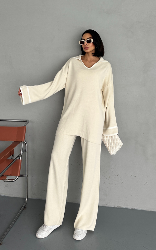 The Avori Set combines comfort and style with its relaxed fit and white stripes accenting the V-neck, sleeves, and pants Waist.
