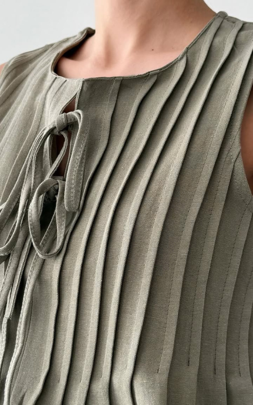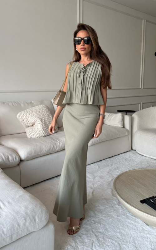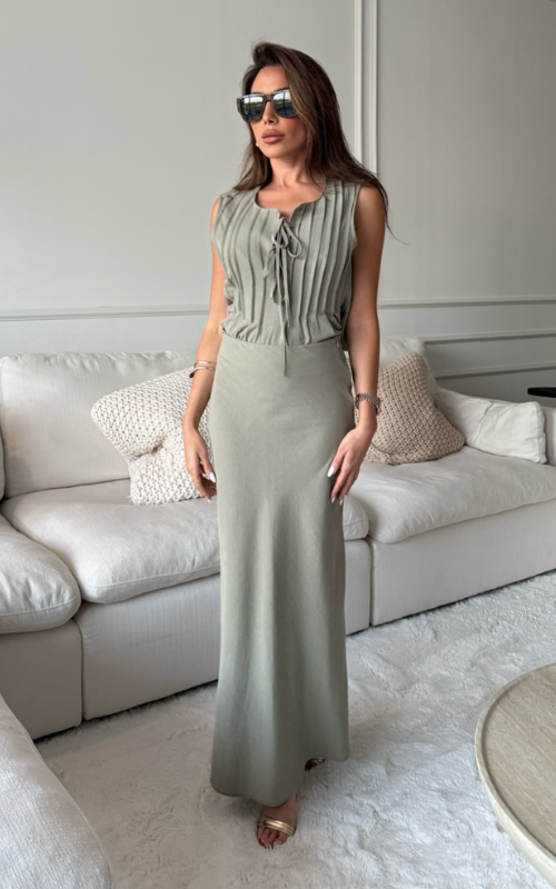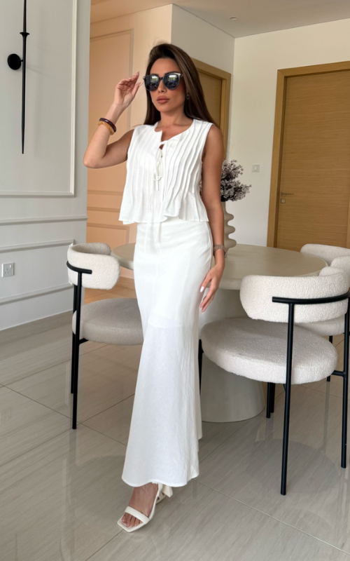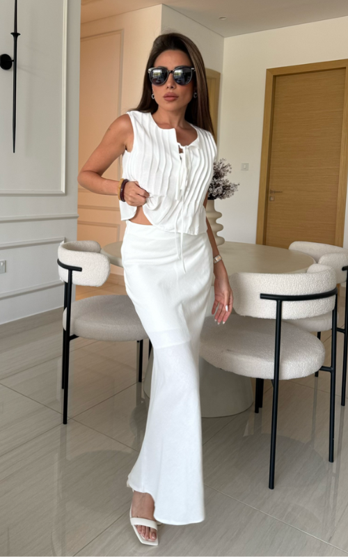 The Ayana Set features a sleeveless top with a round neckline, draped front and chest ties, paired with a flowy skirt—combining elegance and playful charm.