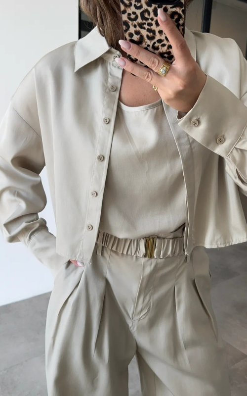The Aysel Set is a stylish 3-piece ensemble featuring a sleeveless top, a long-sleeved blouse, and high-waisted palazzo bottoms with a ruched gartered belt—perfect for an effortlessly chic and coordinated look.