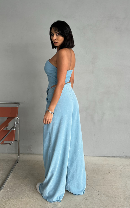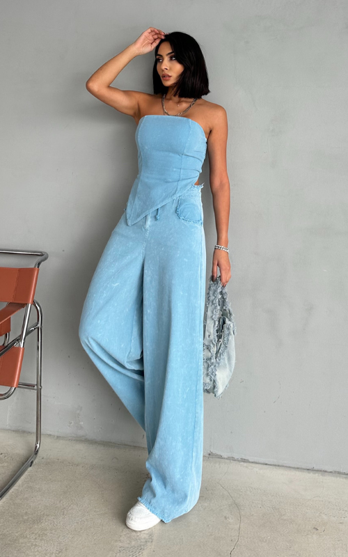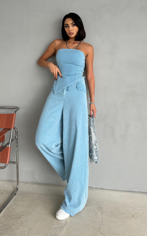 Elevate your style with this chic set featuring a strapless top paired with loose, flowing pants. The top has a bandana-inspired design while the pants offer comfort and ease.