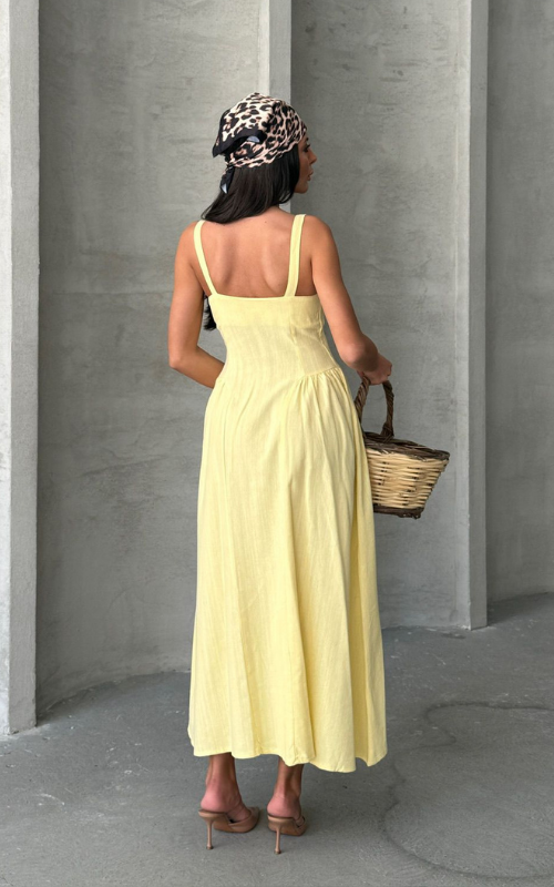 Our Breeze Dress is a flattering midi dress with a lace-up front detail, slim shoulder straps, fitted waist and flowy skirt for a charming countryside feel.