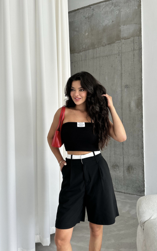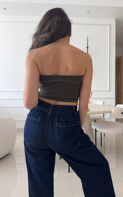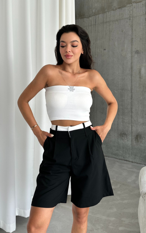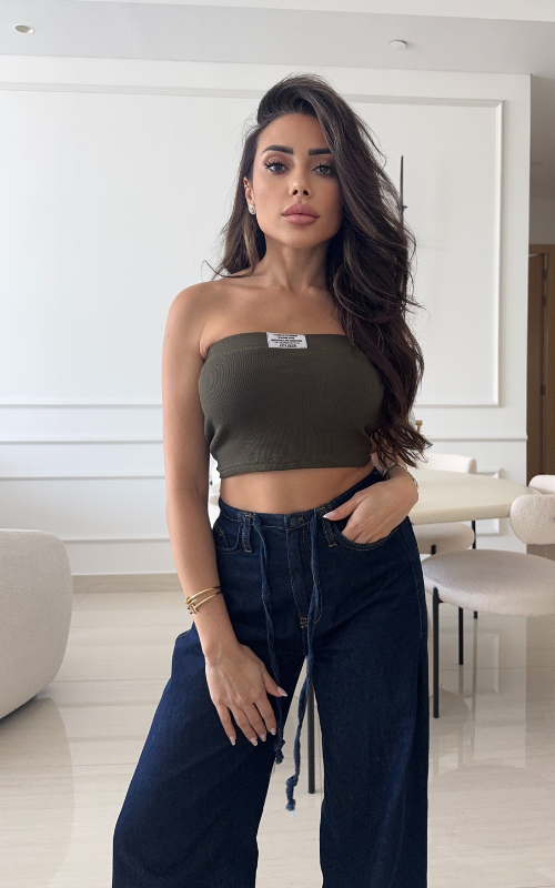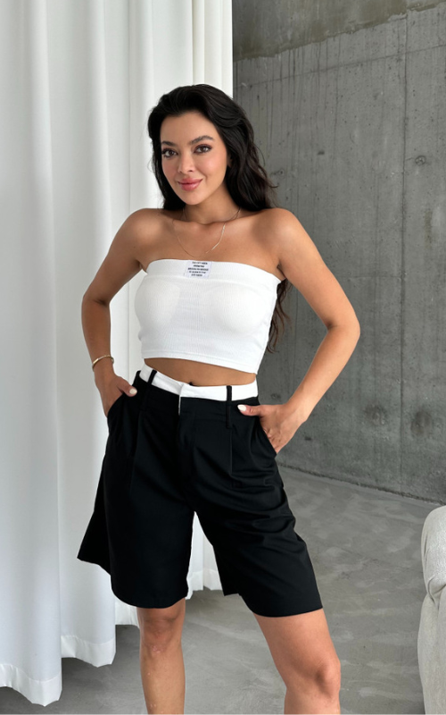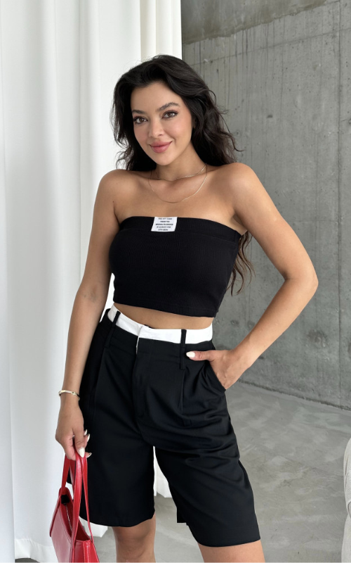 Our Brooklyn Crop Top is a strapless bandeau with padded cups and a stylish front label. Made from ribbed fabric, it offers both comfort and a sleek look.