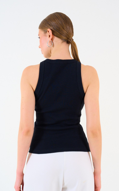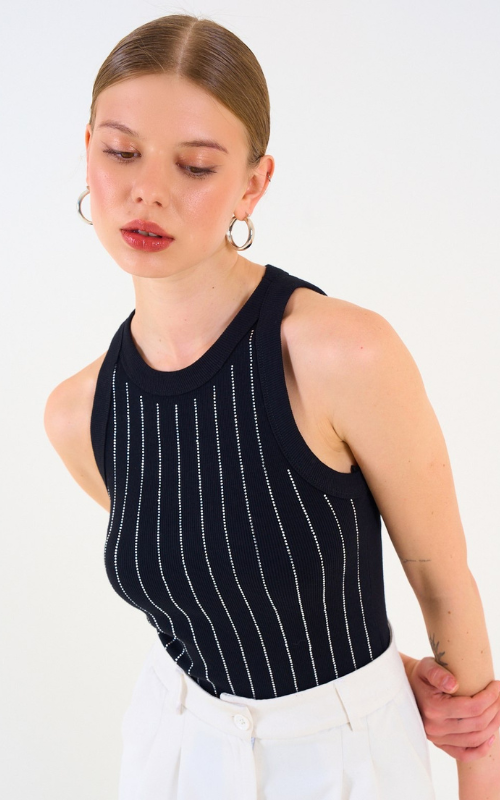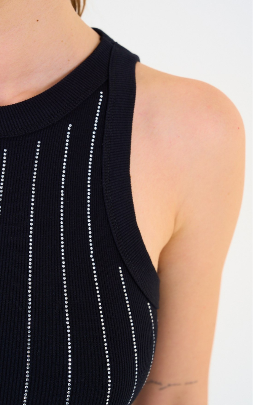 The Cabana Top is a fitted ribbed tank top featuring vertical lines of silver rhinestone embellishments for a sleek, sparkling finish. Designed with a high crew neckline and a stretch fit.