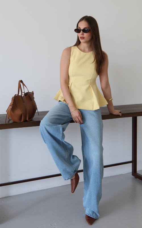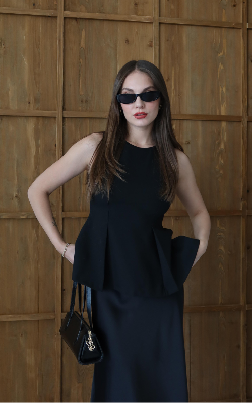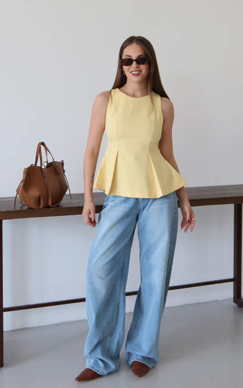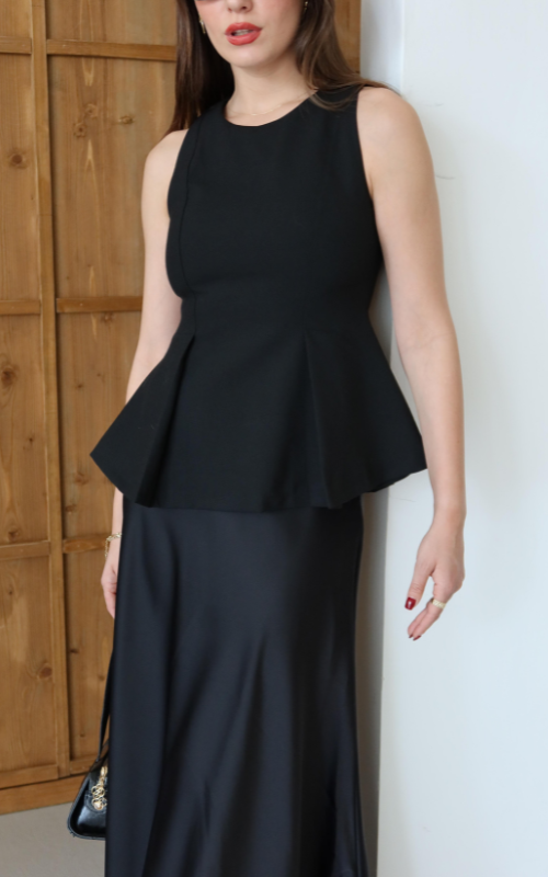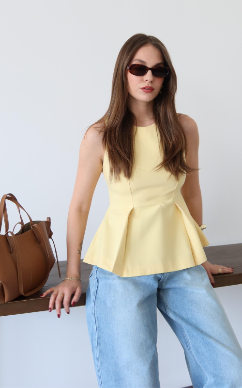The Chello Top is a peplum-style sleeveless top featuring a high round neckline and two front vertical pleats with back zipper closure.