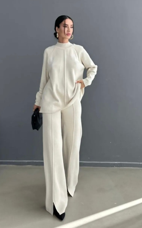 Elevate your style with the Chic Split Set. This white knit ensemble features split hems on the top and pants, blending modern flair with comfortable elegance. Perfect for any occasion!