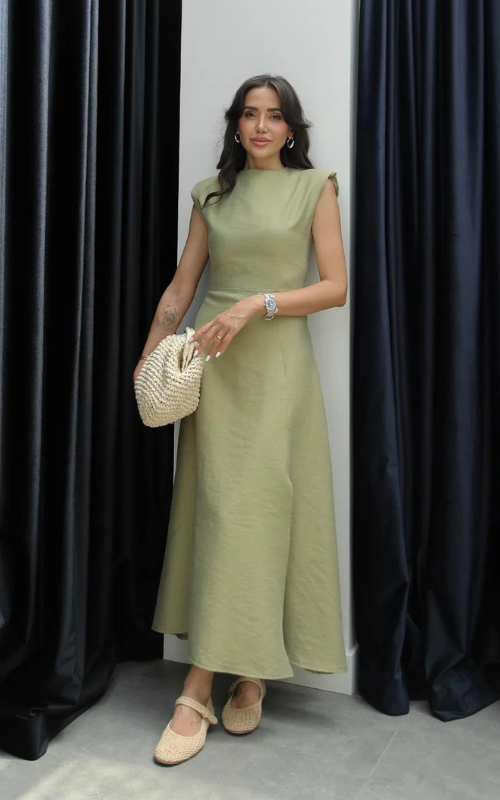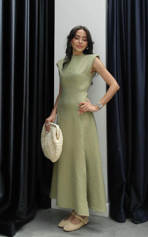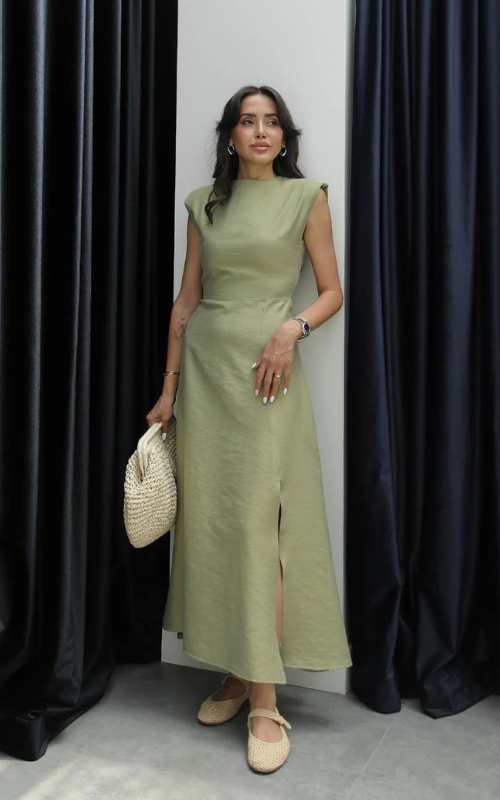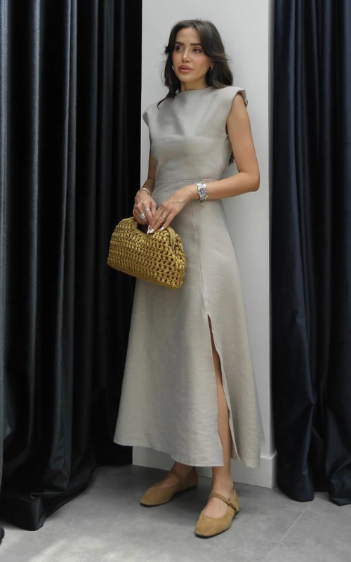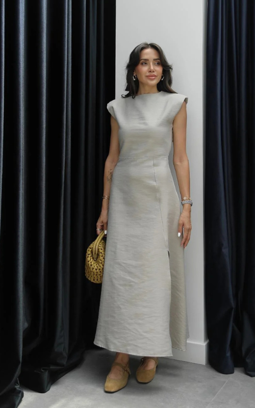 The Chloe Dress is a midi dress featuring padded shoulders, a high round neckline, and a flattering fitted waist. Designed with a side slit for added movement and elegance.