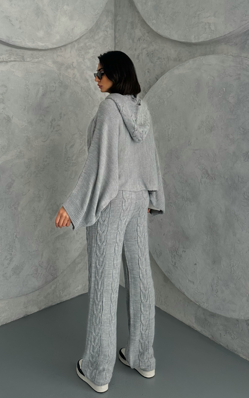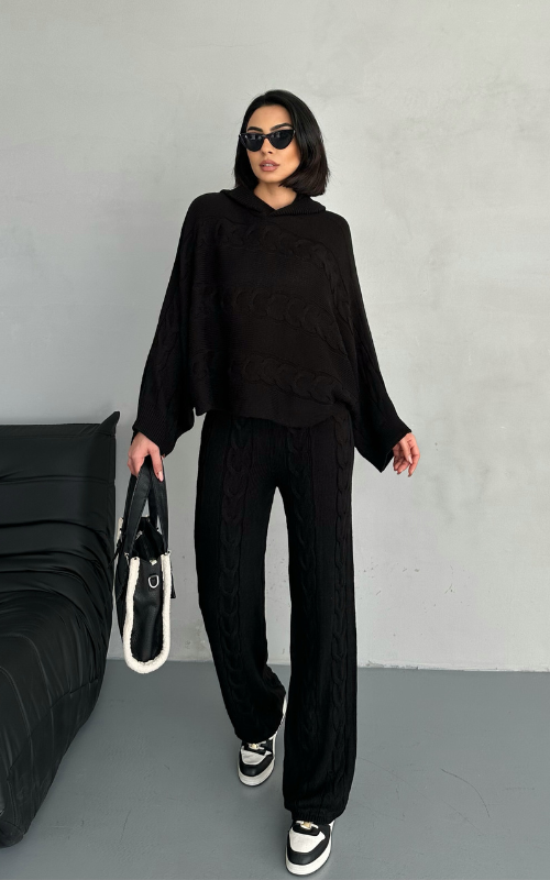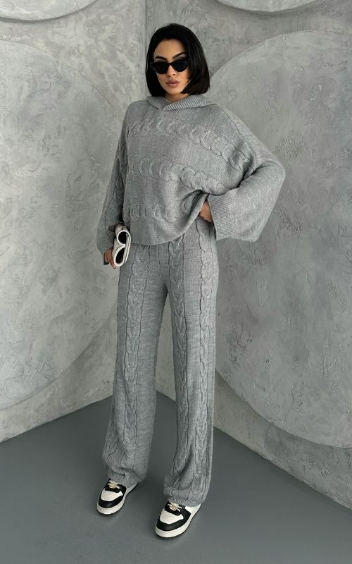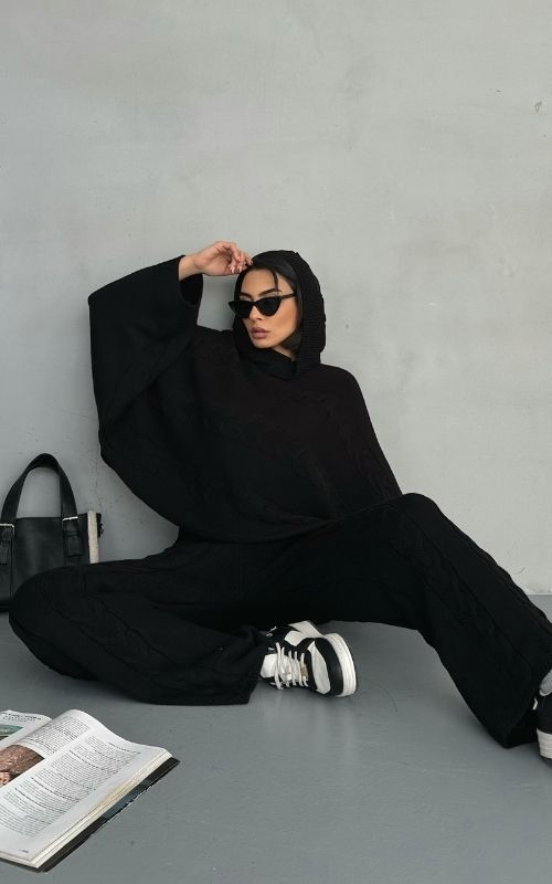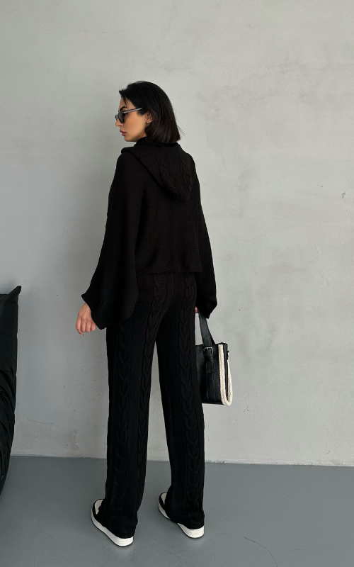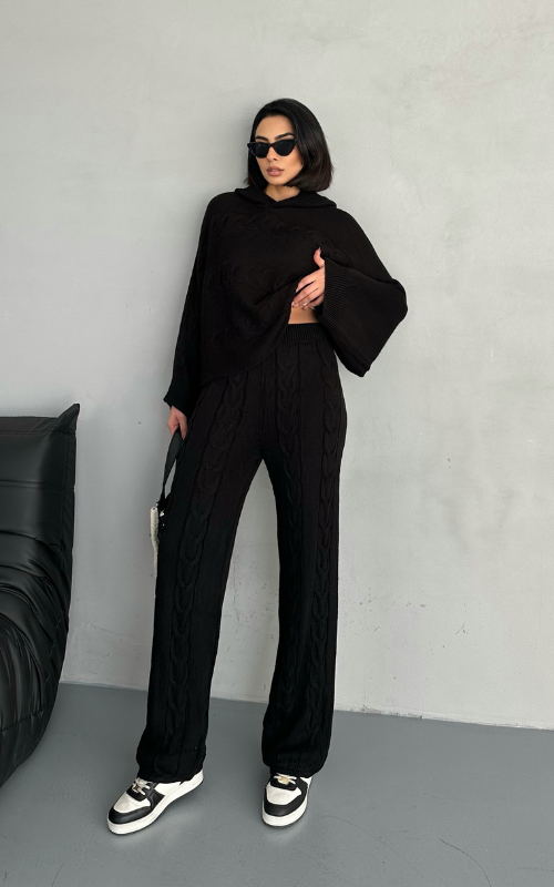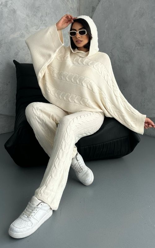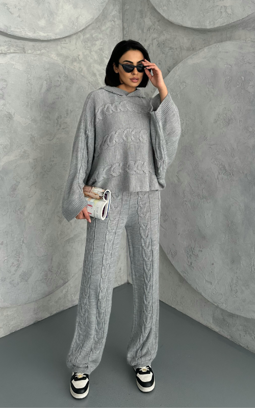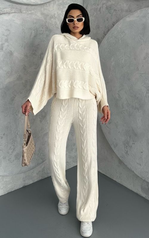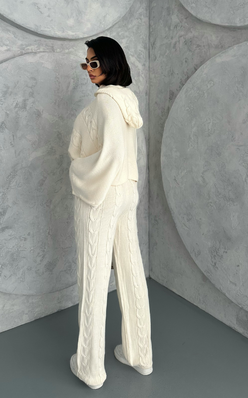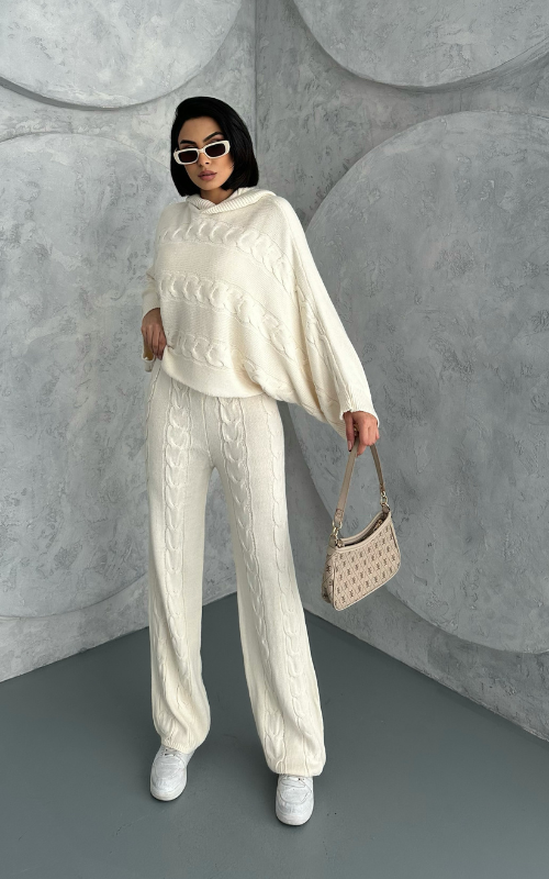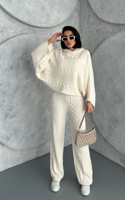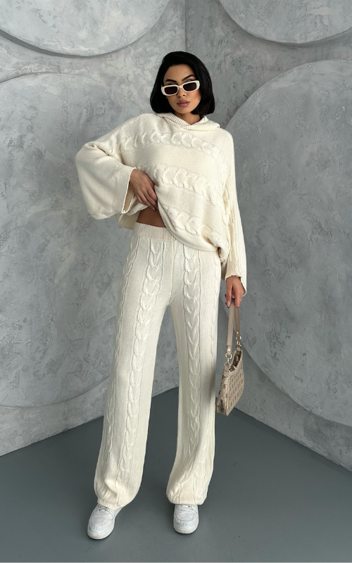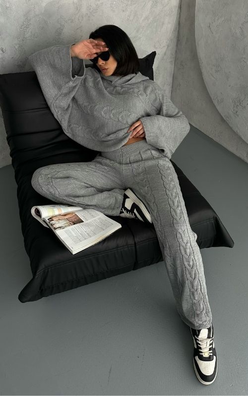 Our Chloe Set features a cozy embossed fabric, adding a unique texture. The top comes with a relaxed hoodie, while the comfortable pants ensure warmth and style.