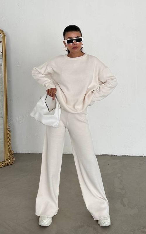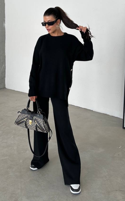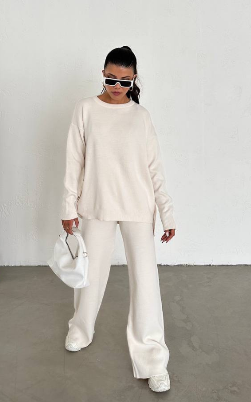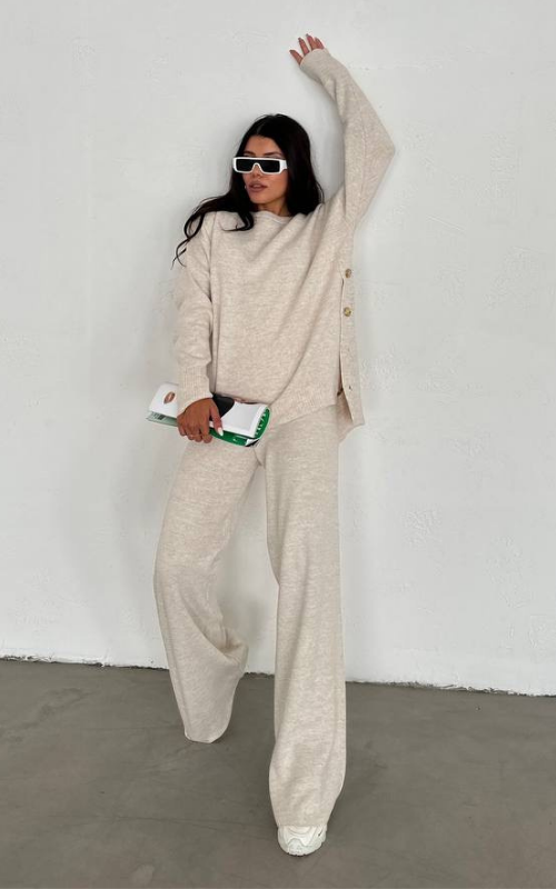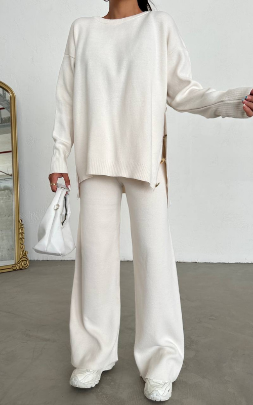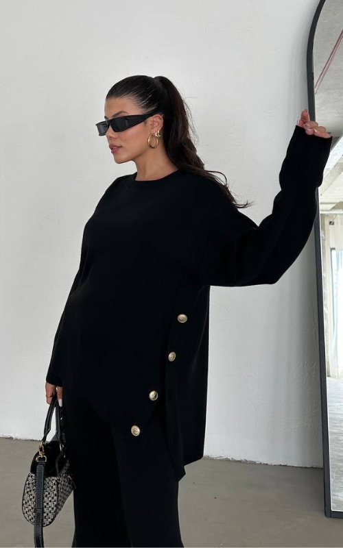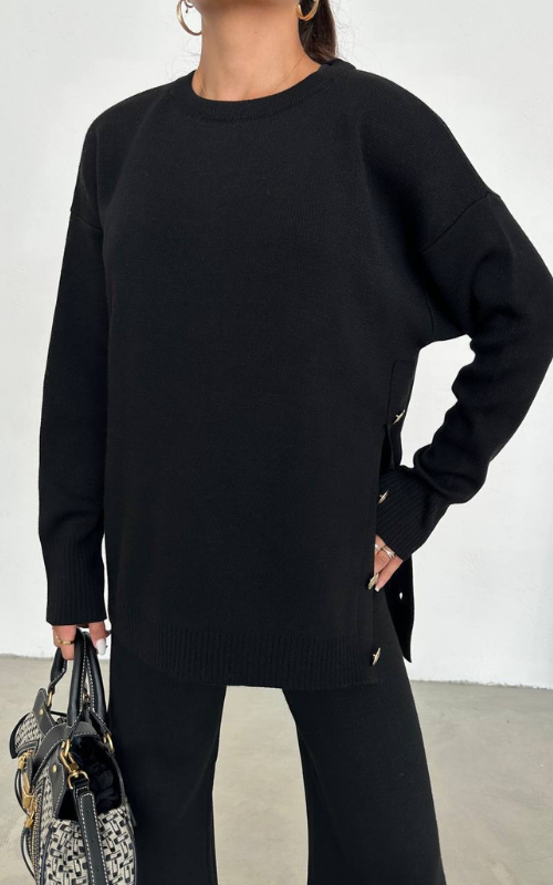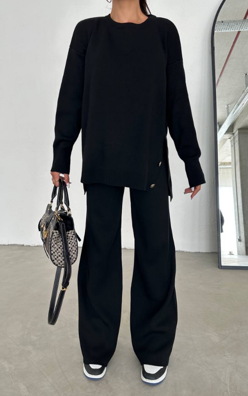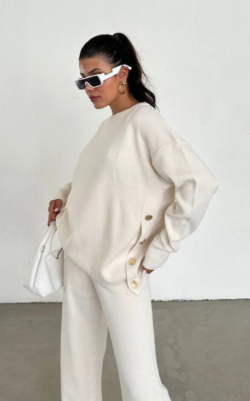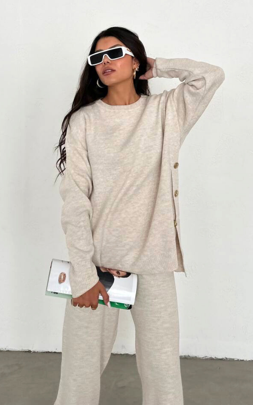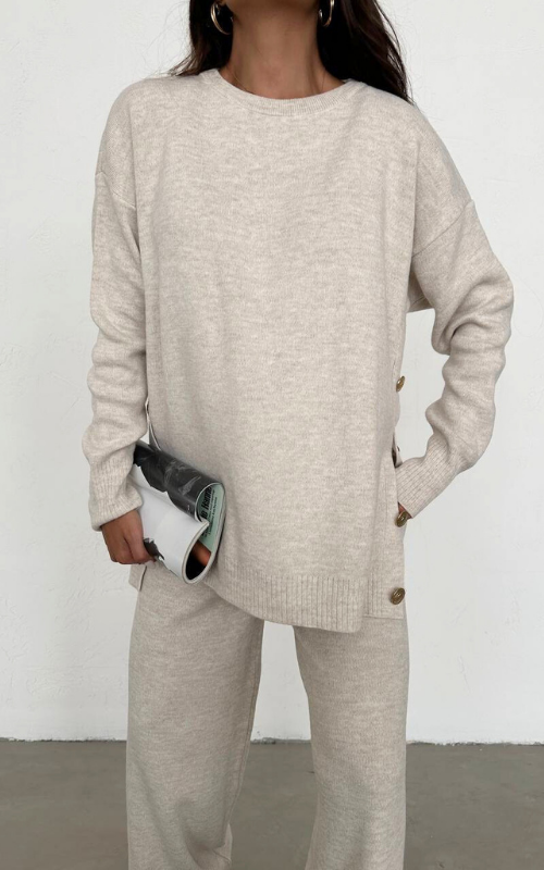 The Cozy Vibe Set features a knit round neck top adorned with gold button details on the split sides, paired with matching bottoms. This stylish ensemble combines comfort with a touch of elegance.