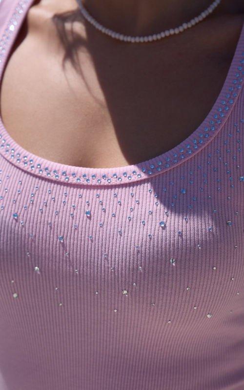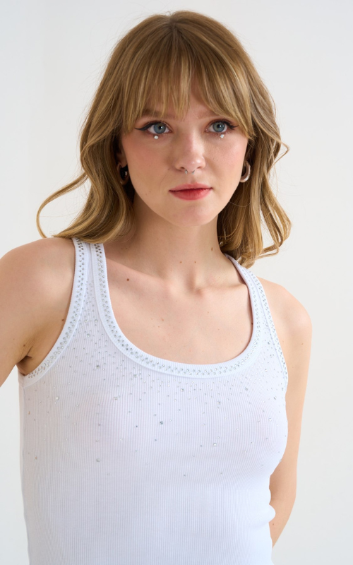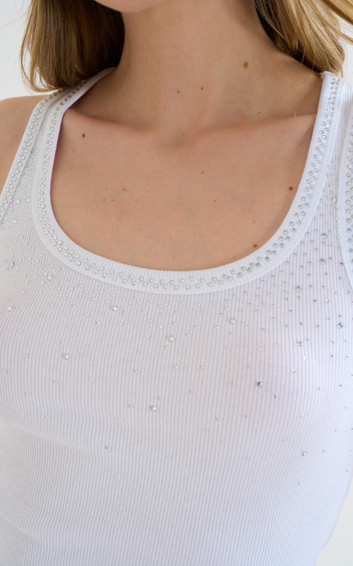 Our Crystal Top is a must-have fitted ribbed tank top featuring delicate crystal embellishments and a scoop necklline – perfect for adding sparkle to casual looks.