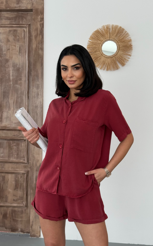 Turn heads with the Dahlia Set, featuring a short-sleeved top adorned with front buttons and a pocket, paired with matching shorts to complete the stylish and effortless look.
