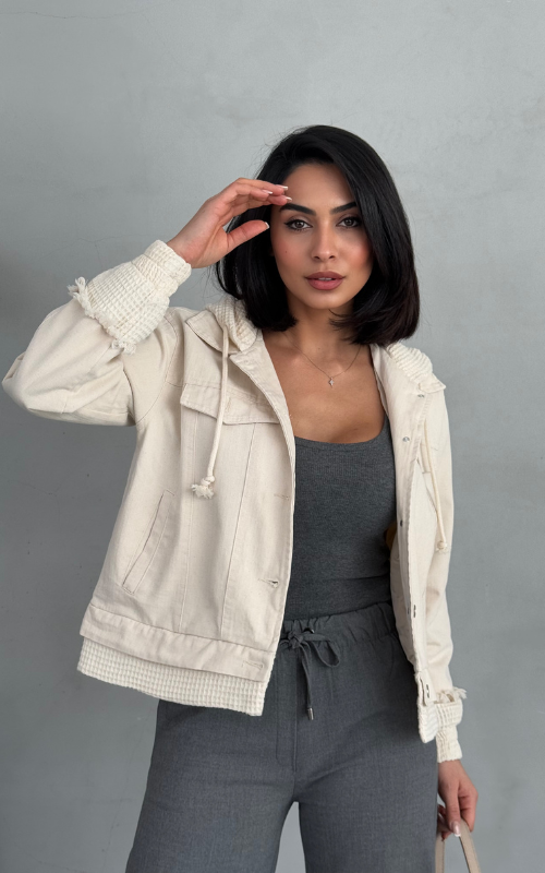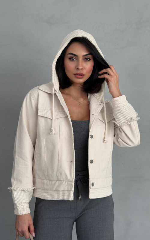 Stay stylish and cozy with our Danny Jacket, made of two-textured fabric, it features a chic hood, frayed cuff details, double-breasted front pockets design and premium front buttons.