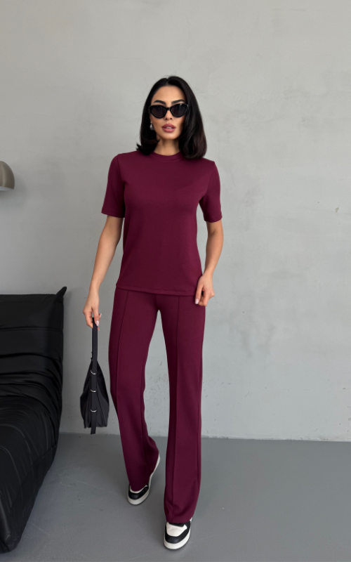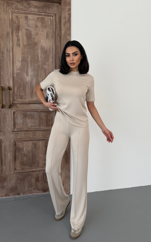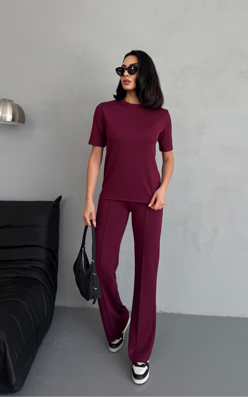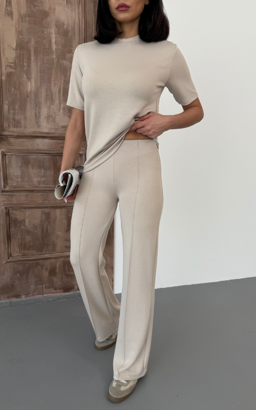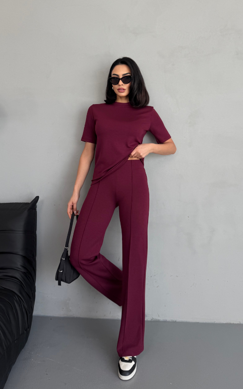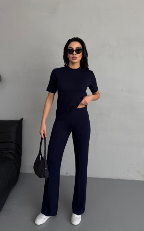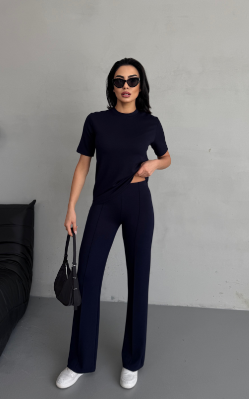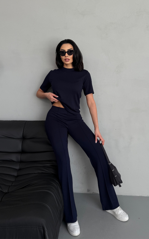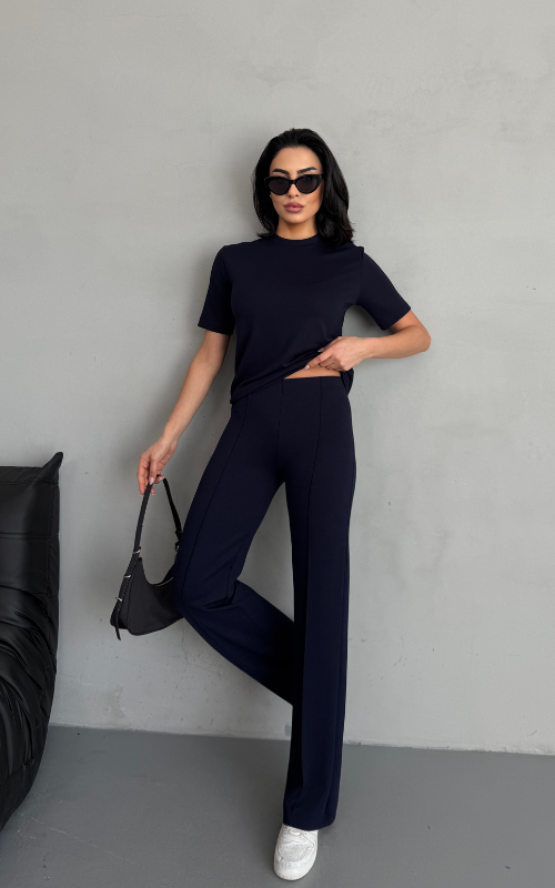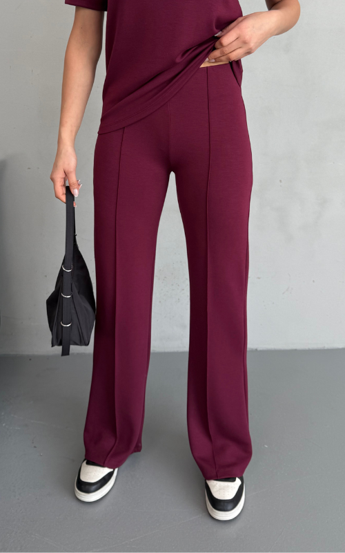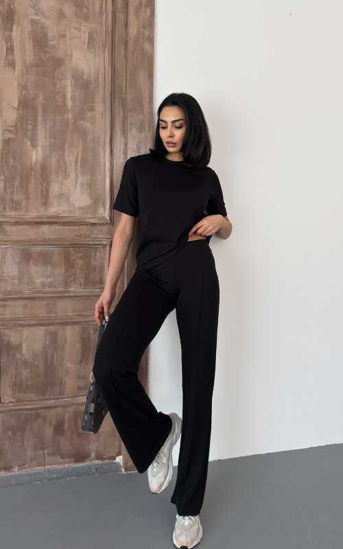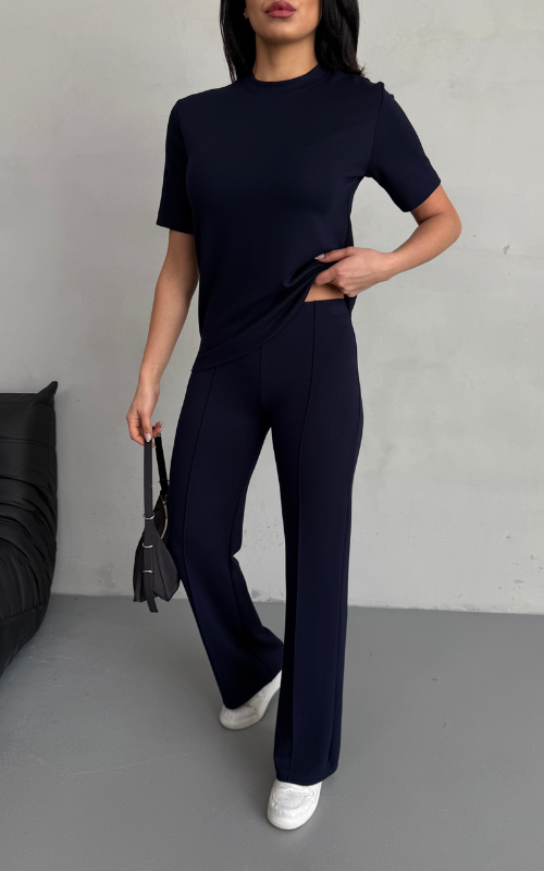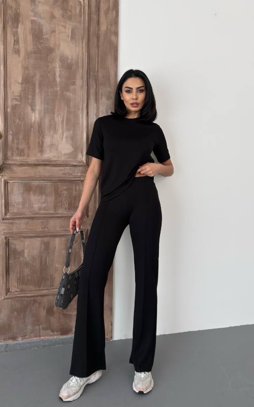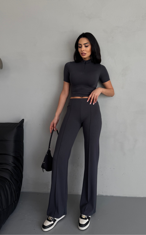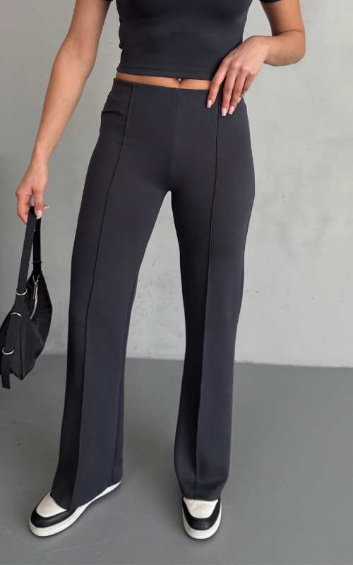 Our Degree Pants feature a flared cut that flatters the shape, a sleek front crease, and are crafted from stretchy fabric with a high-waisted design, offering both style and comfort.