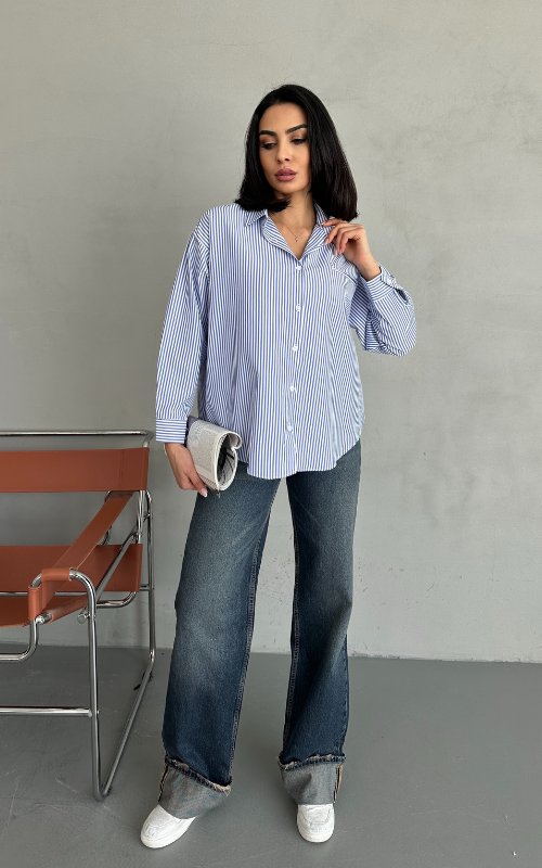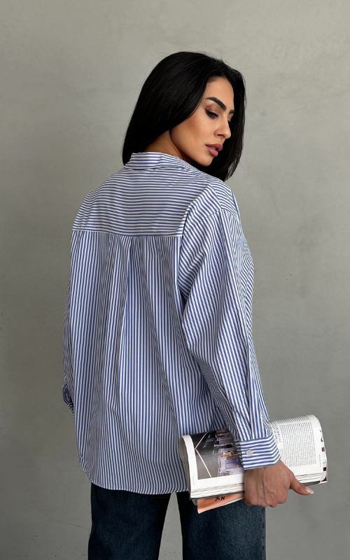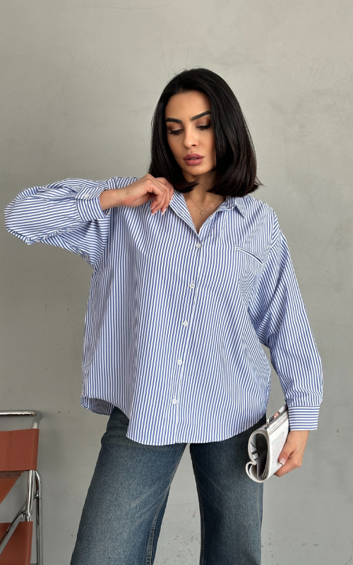 Our District Top is an oversized design featuring a stylish striped pattern, a crafted collar, and a cute flap pocket on the front left side. It also has a front button closure, offering a relaxed yet trendy look.