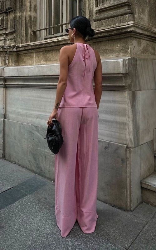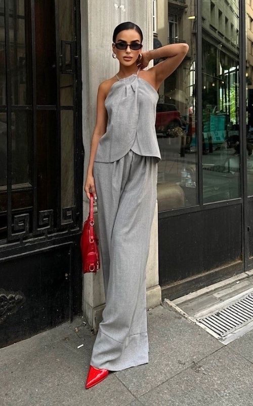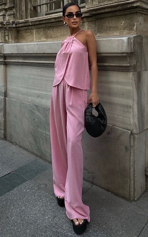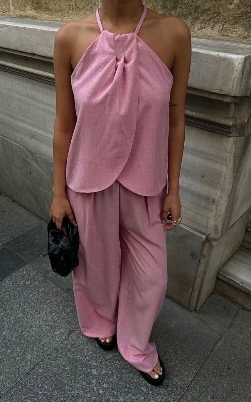 Perfect for both casual and dressy occasions, our Elizabeth Set offers a flattering halter neck top and flared bottoms with unique design, both crafted from soft, luxurious fabric.