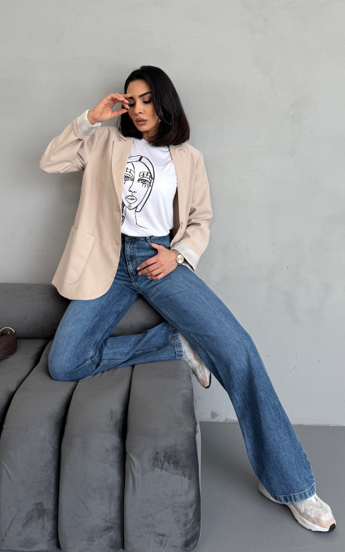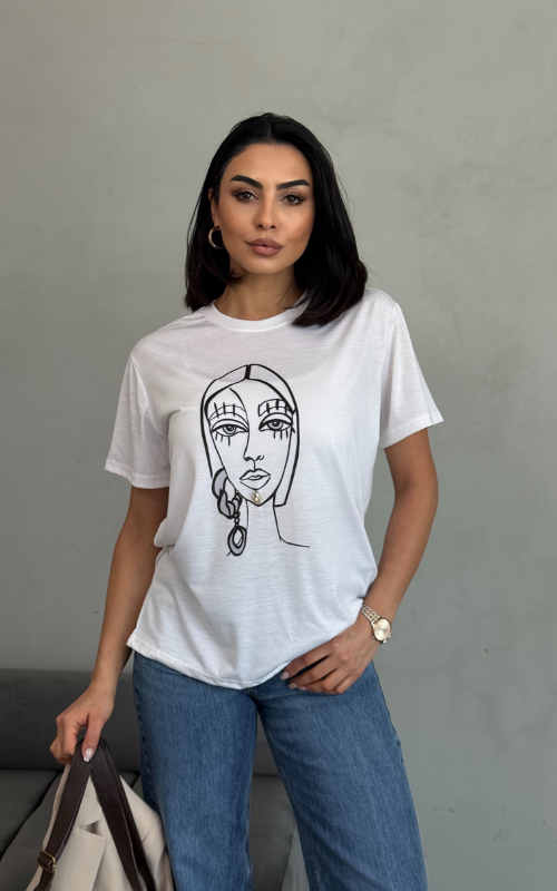 Our Elsa Top features a feminine print of a woman on the front, a classic crew neckline, and short sleeves, offering a chic and artistic touch to your wardrobe.