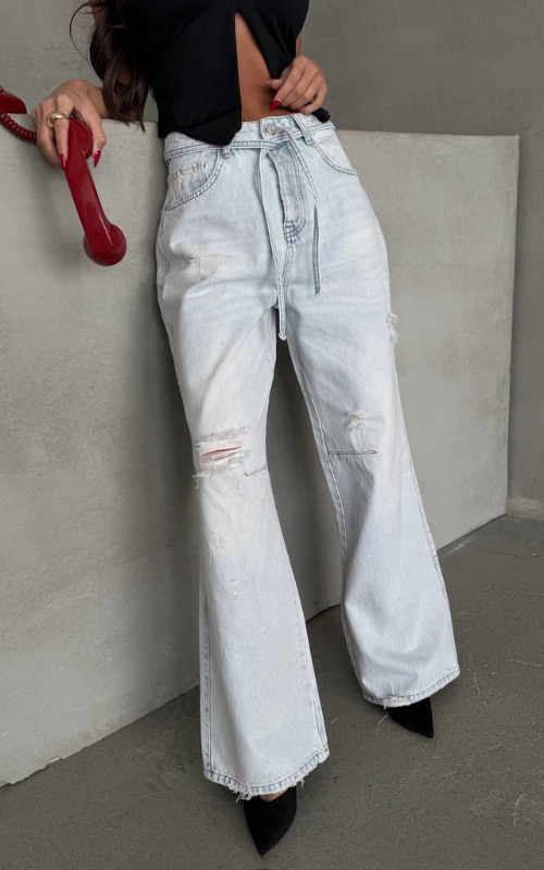 The Faded Pants is a high-rise light-wash wide-leg jeans with a relaxed fit, ripped knee details, and a drawstring waist for a sporty-casual twist.