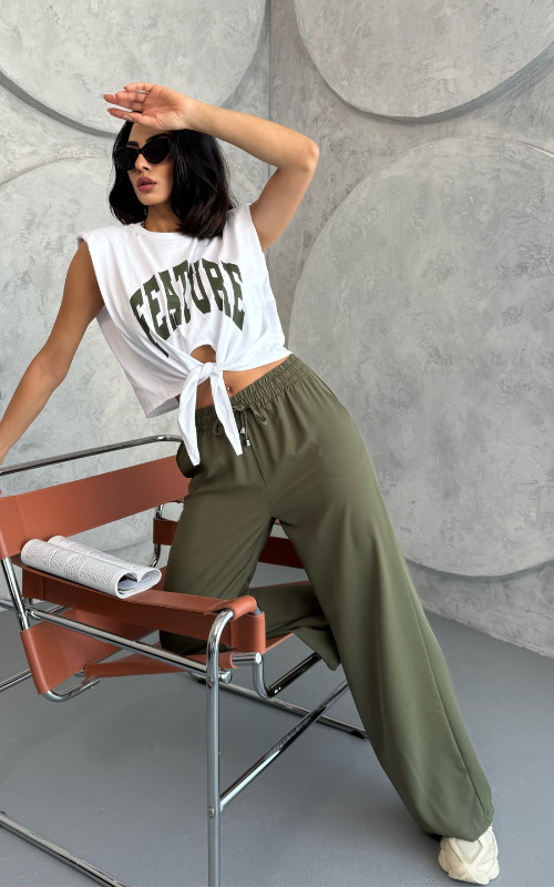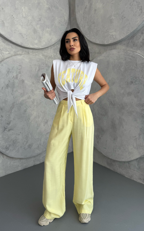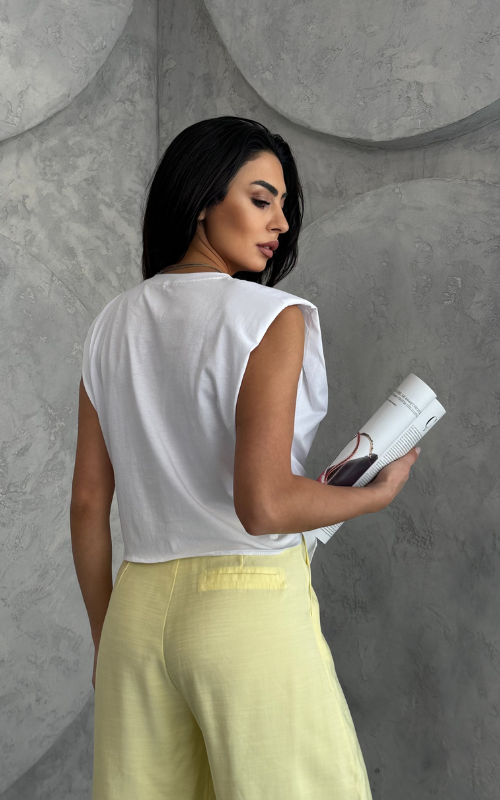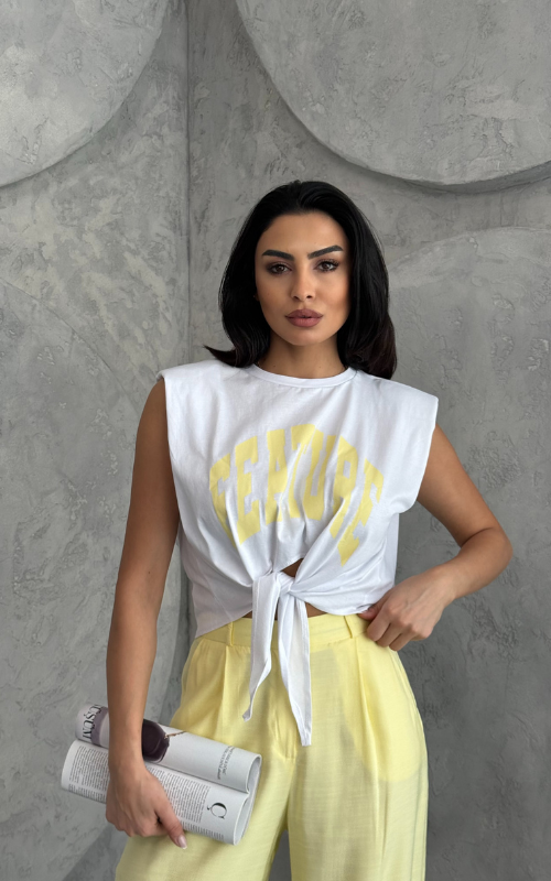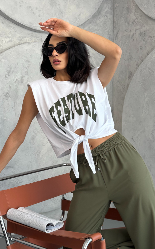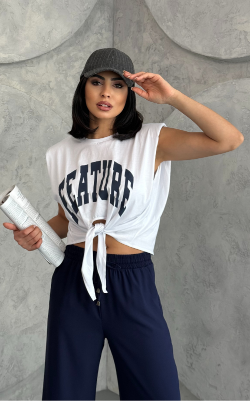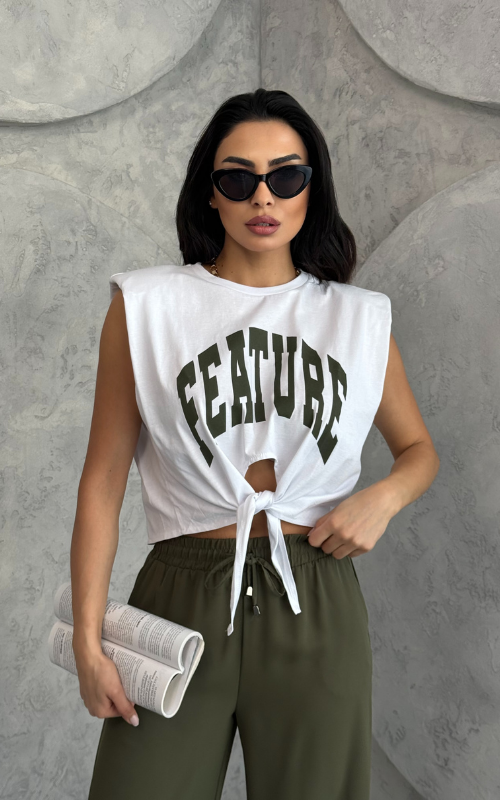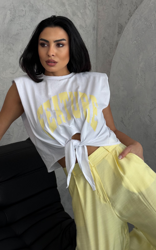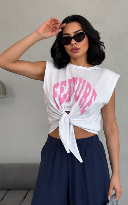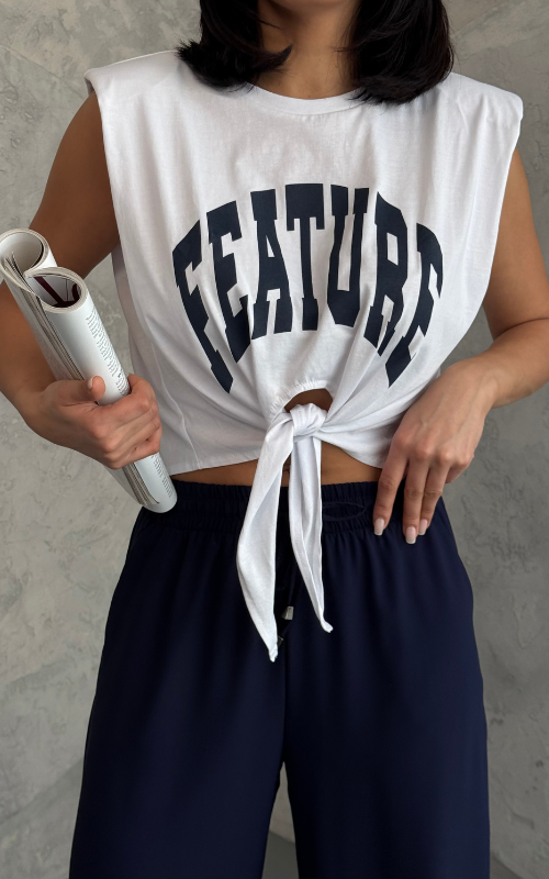 Our Feature T-Shirt, features padded shoulder, a crew neckline, cute tie-up detail, and a bold ‘FEATURE’ print on the front, blending edgy style with a trendy, structured look.