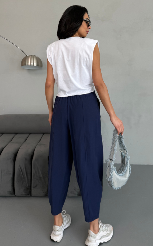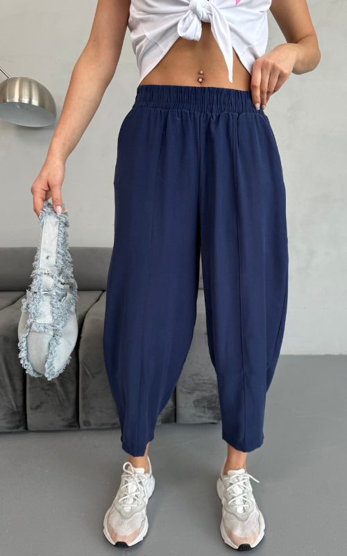 Our Gloria Pants are crafted from premium fabric for ultimate comfort, featuring an elastic waistband, a sleek tapered cut, and a stylish front-lined design for a polished look.