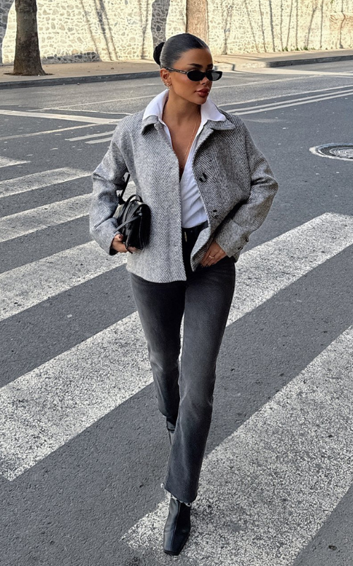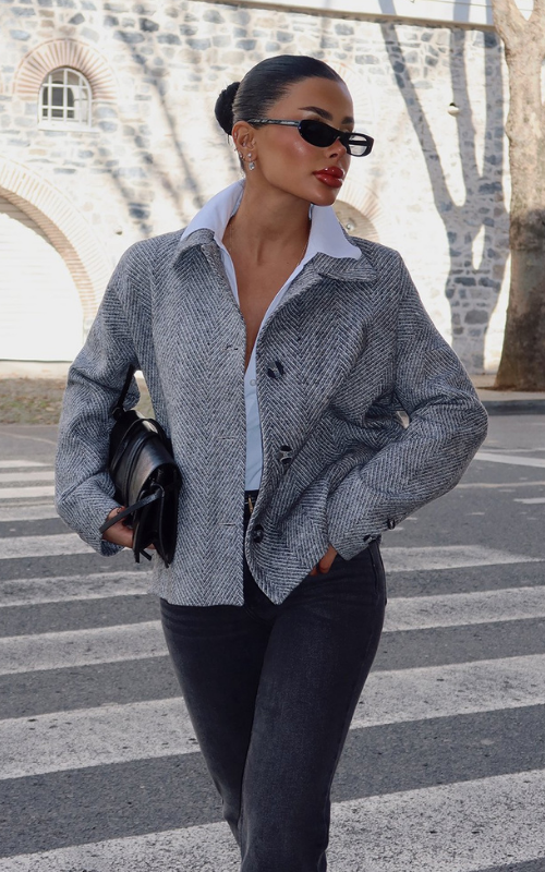Our Hannah Jacket features a textured, patterned fabric with a sleek, minimalist design, featuring subtle buttons and a classic collar for a refined, understated look.