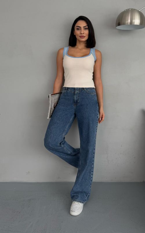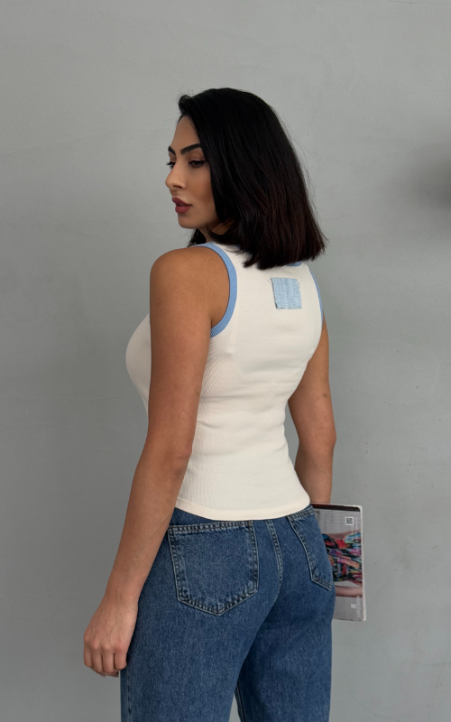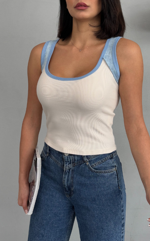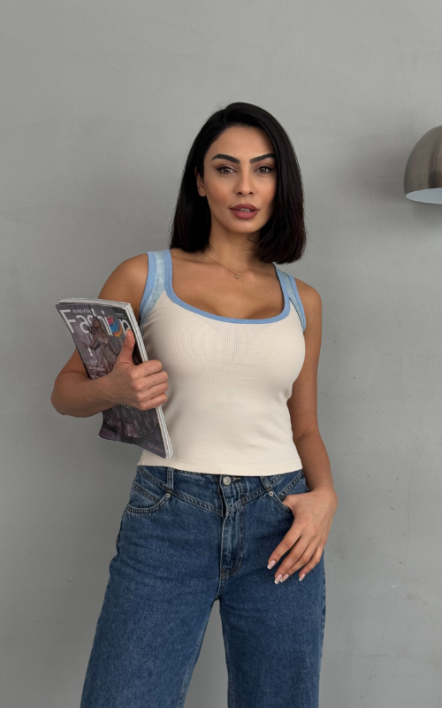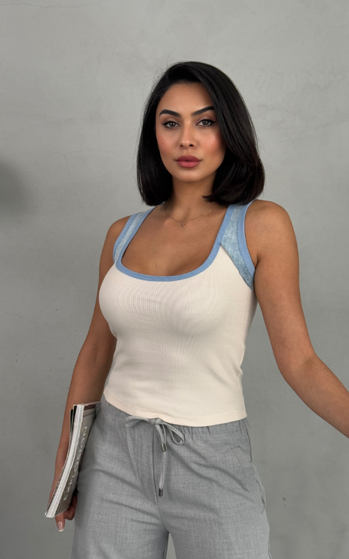 The Joy Top features a light blue edge on its U-neckline and plain light blue shoulder straps. This versatile top is perfect for casual wear or layering.