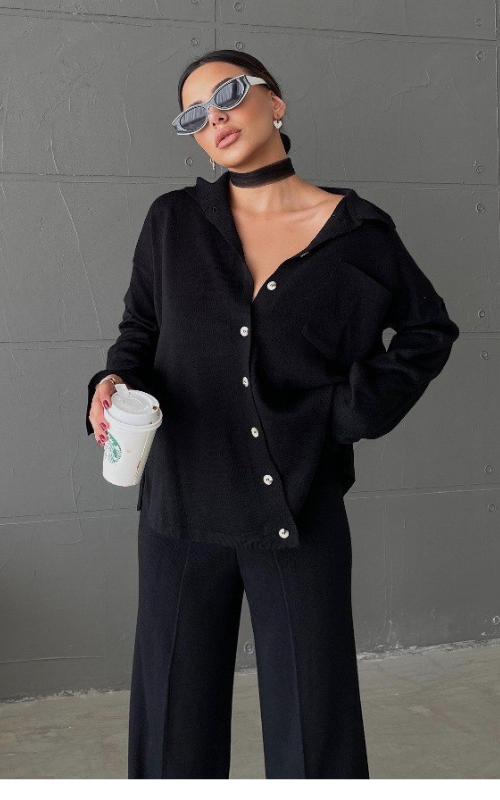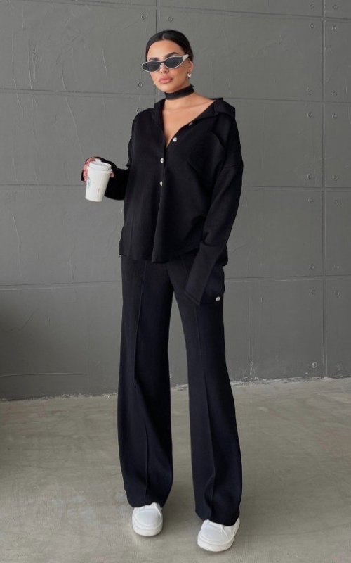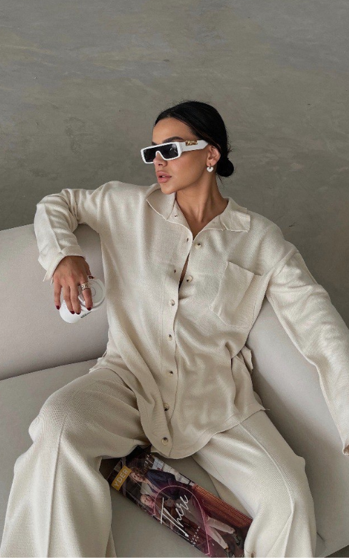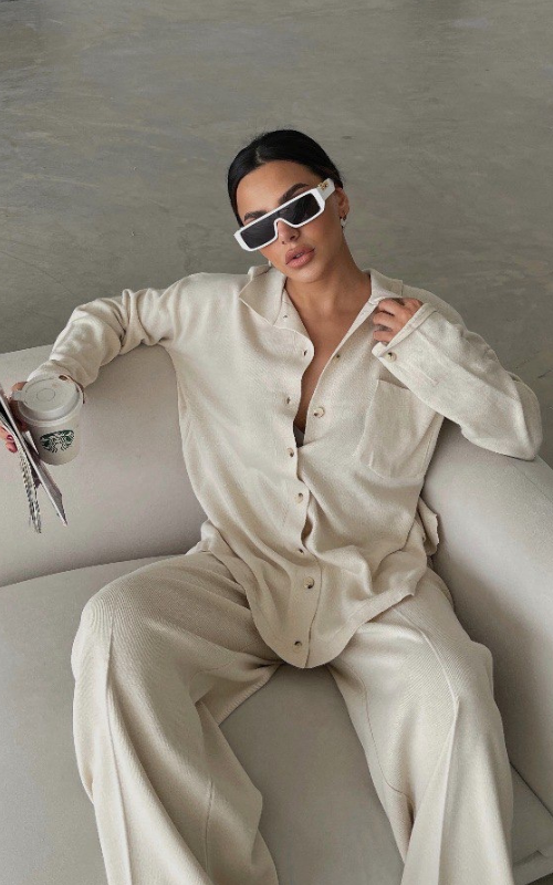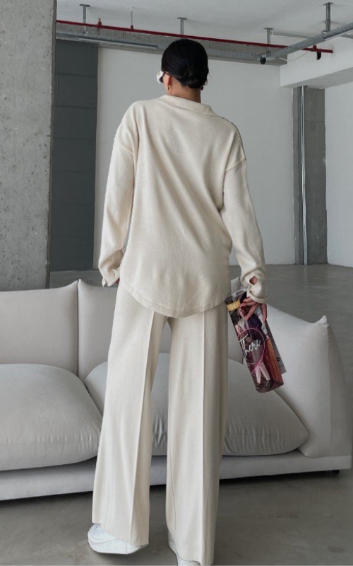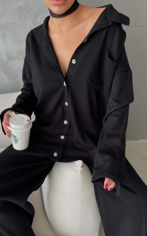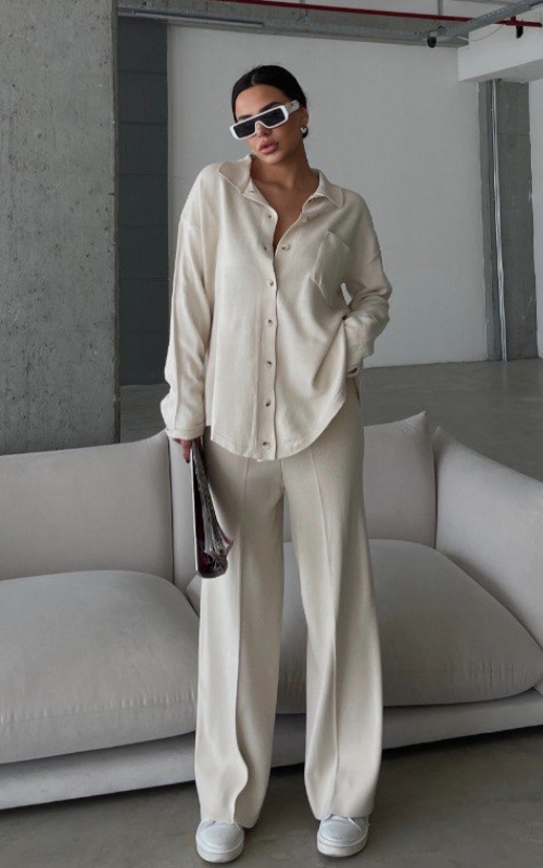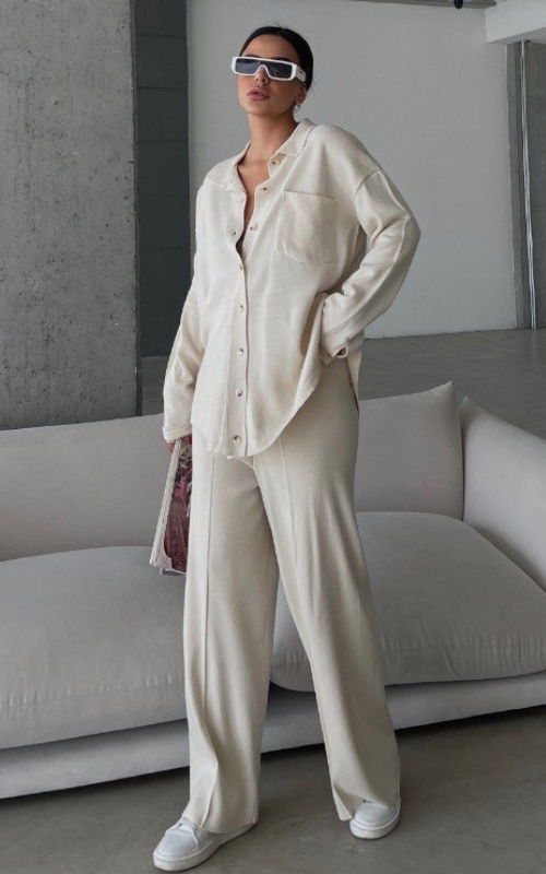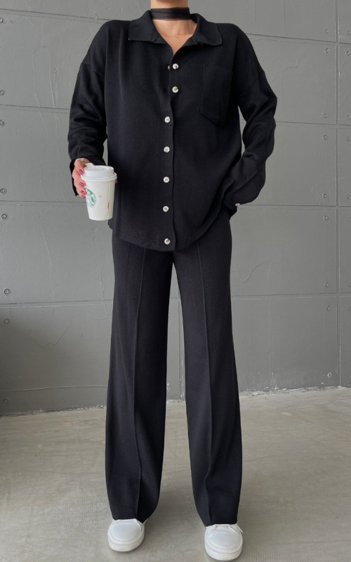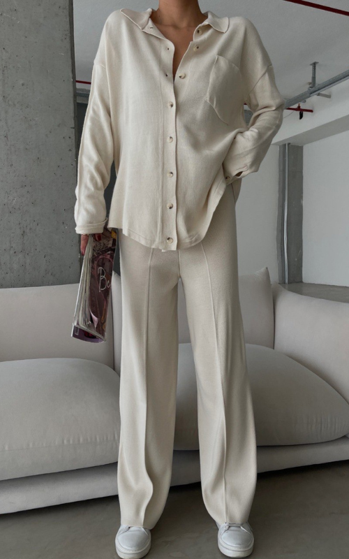 The Lelani Set features a light knit pant set paired with an oversized button-up shirt, offering a relaxed yet stylish look. Perfect for casual outings or lounging, this comfortable ensemble combines effortless elegance with versatile wearability.