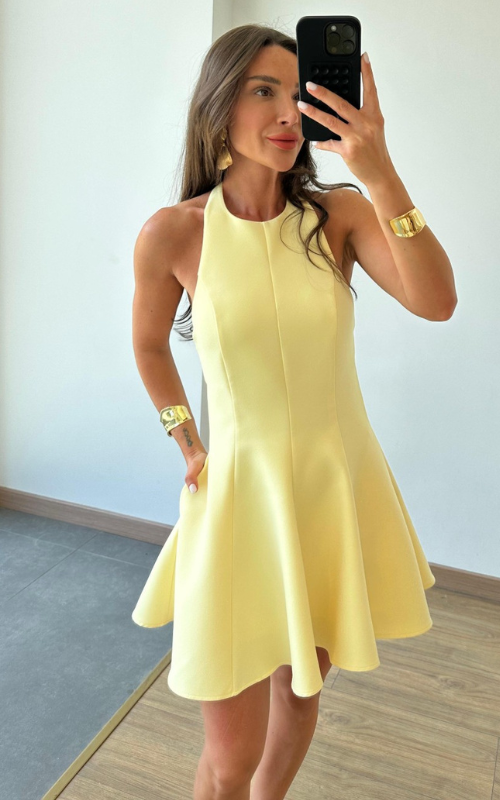 The Linda Dress features a halter round-neck, sleeveless design with a graceful, flowy silhouette—perfect for an effortlessly elegant and feminine look.