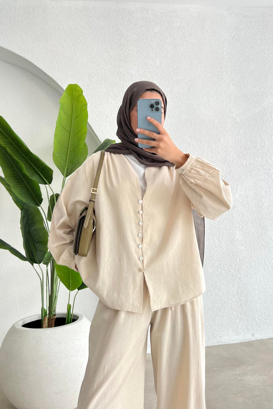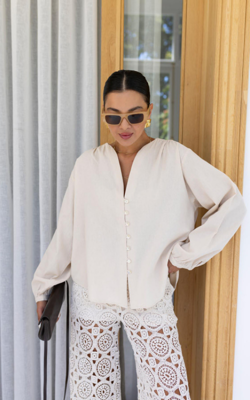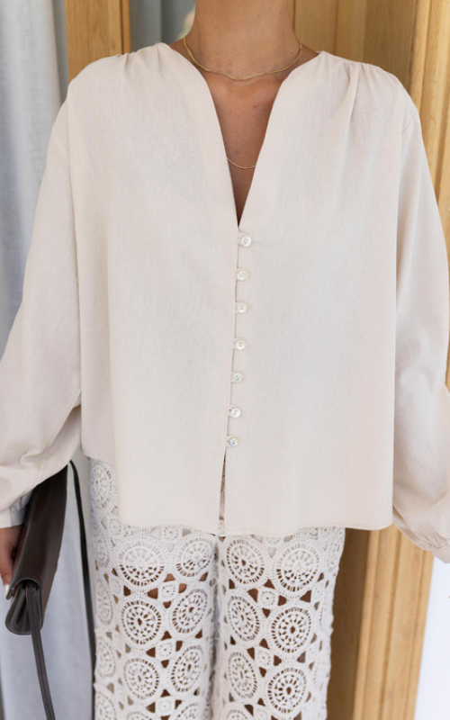 The Lucia linen shirt boasts a sophisticated V-shaped neckline that elevates your style. Made from soft, breathable linen, this shirt offers a relaxed yet polished look, perfect for both casual and formal settings.