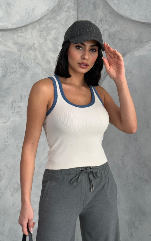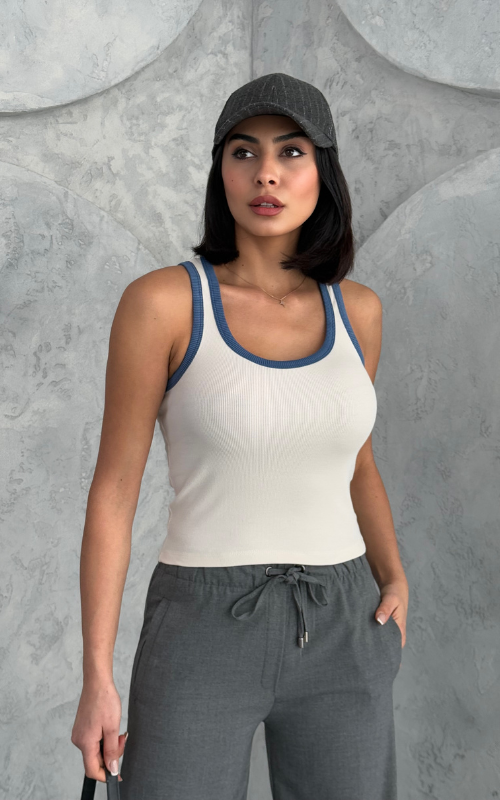 The Mandy Top has a U-neckline with blue lines on the neck and shoulder straps. This versatile piece adds sophistication to any outfit.