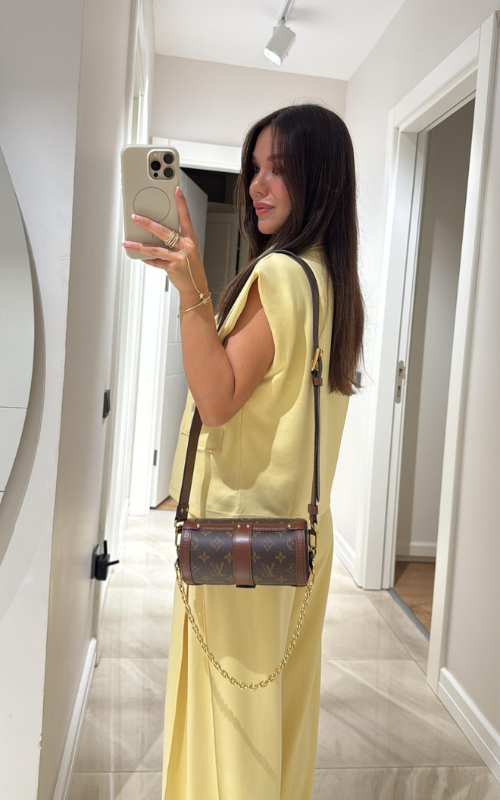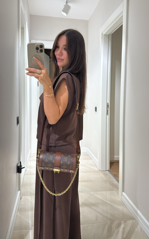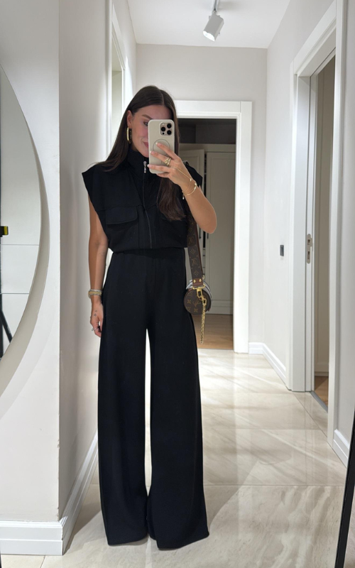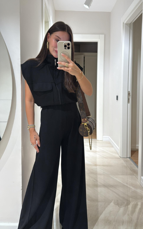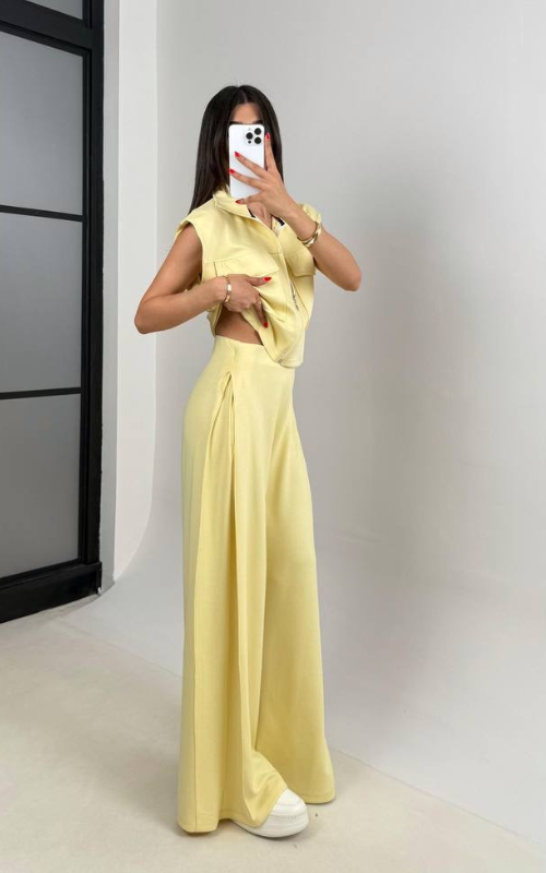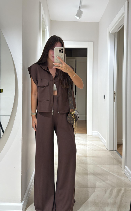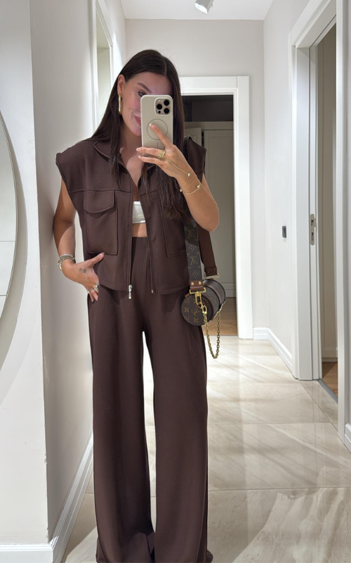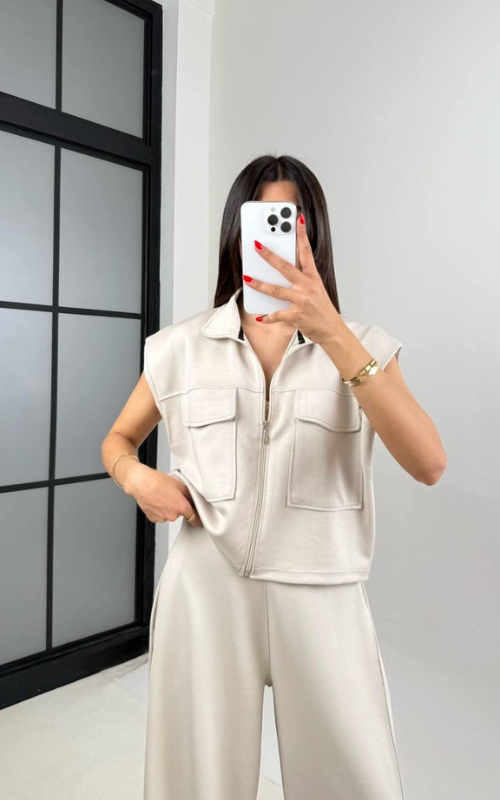 The Myth Set features a zip-up sleeveless top with structured shoulders and flap chest pockets, paired with high-waisted wide-leg trousers. Designed for comfort and effortless elegance.