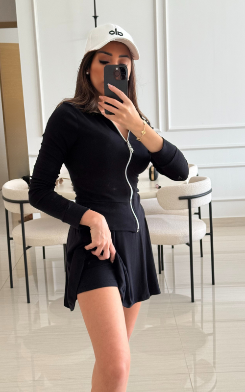 The Naya Set offers a comfortable and stylish look with its long-sleeved top featuring a front zipper closure, paired perfectly with a pleated skort for a sporty yet chic vibe.