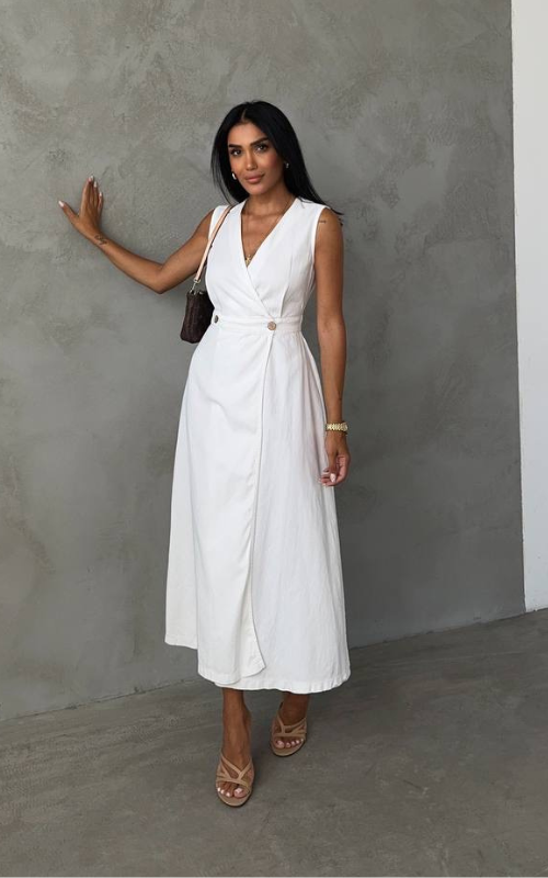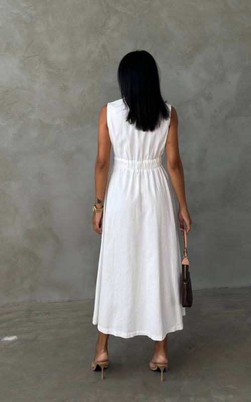 The Nia A-Line Dress features decorative buttons at the waist that mimic a belt, offering a flattering silhouette. Perfect for any occasion, it combines elegance and comfort effortlessly.
