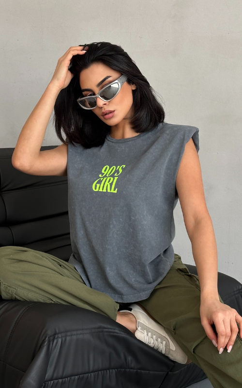 Our Nineties T-Shirt is a sleeveless padded T-shirt featuring a crew neckline and a bold ’90’’s Girl’ print on the front, offering a trendy, retro-inspired look with a modern edge.