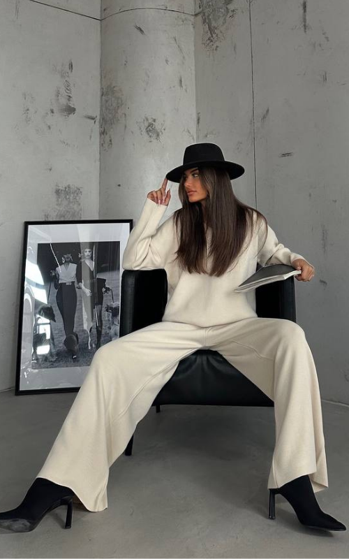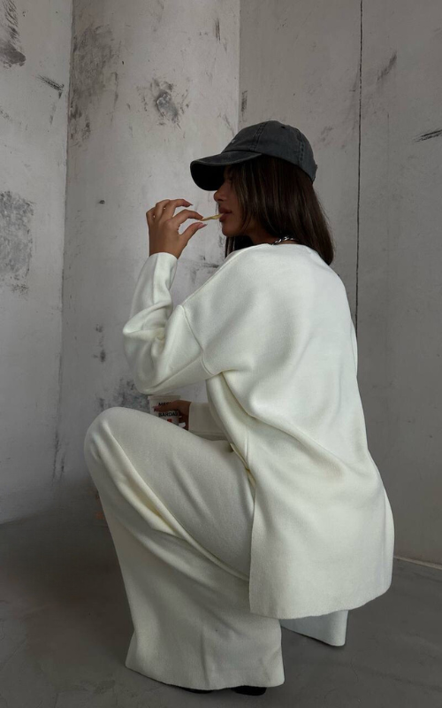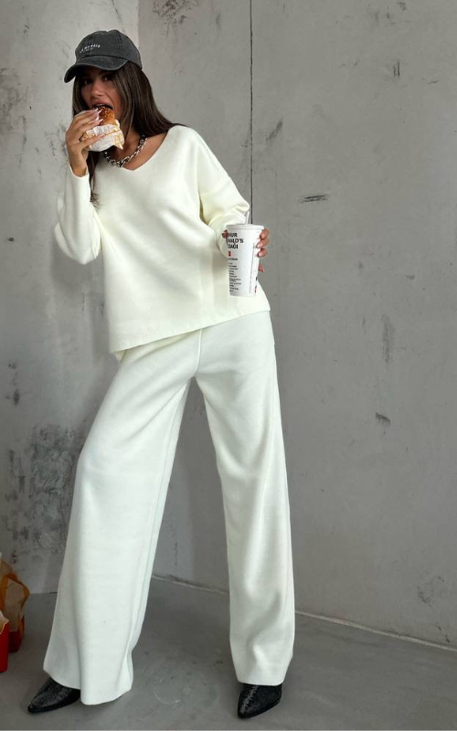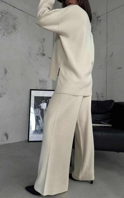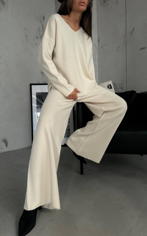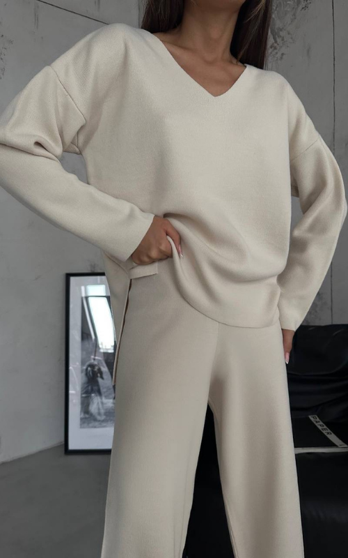 Elevate your wardrobe with the Nova Nok Set. This stylish ensemble features a V-neck oversized top paired with matching knit pants, offering ultimate comfort and a relaxed fit.