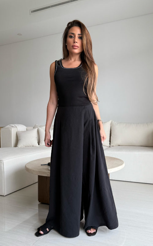 The Outline Top is a sleek, fitted sleeveless tank top featuring a scoop neckline and bold white contrast stitching along the neckline and armholes.