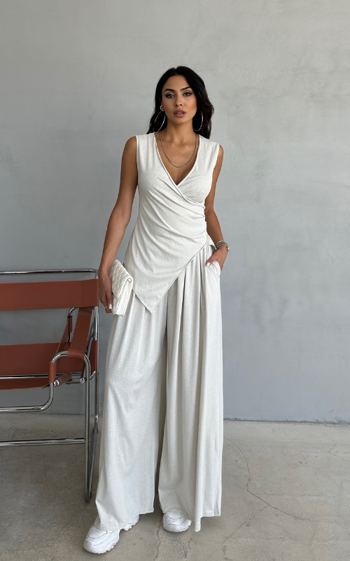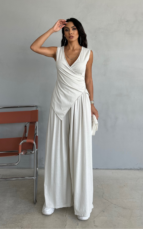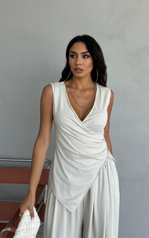 Our Pamela Set features a sleeveless, V-neckline top paired with a garterized waist pants. The top’s wrapping detailing adds a touch of sophistication, while the pants ensure an easy wear.