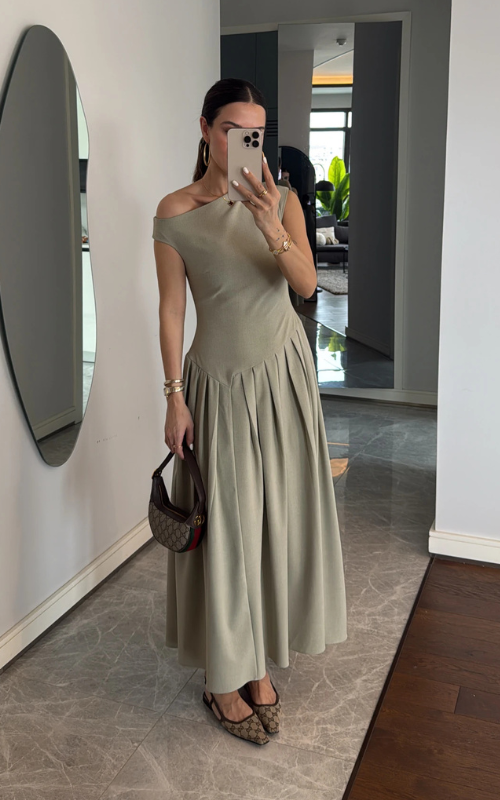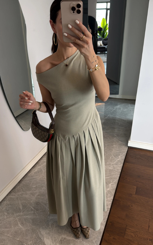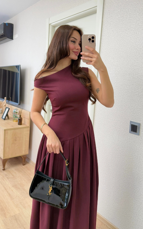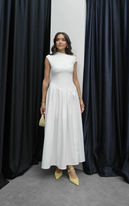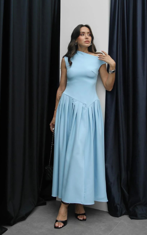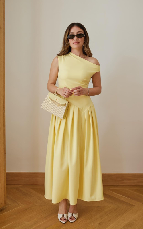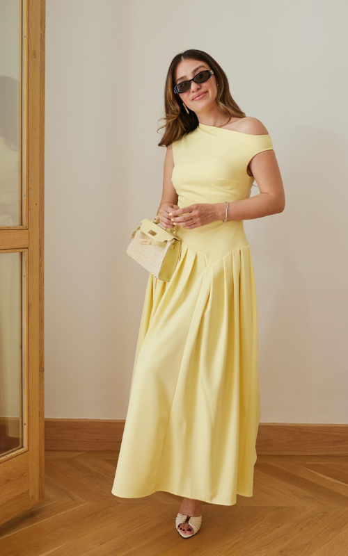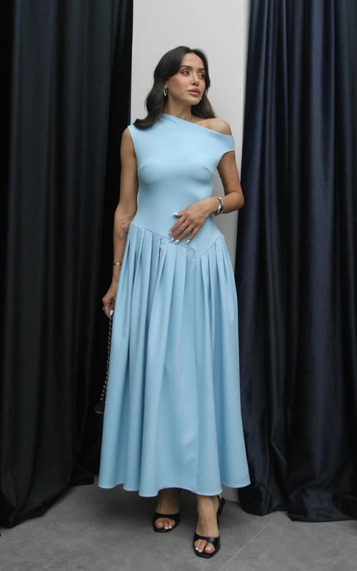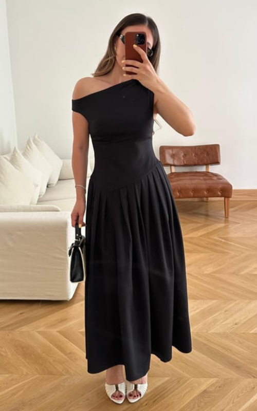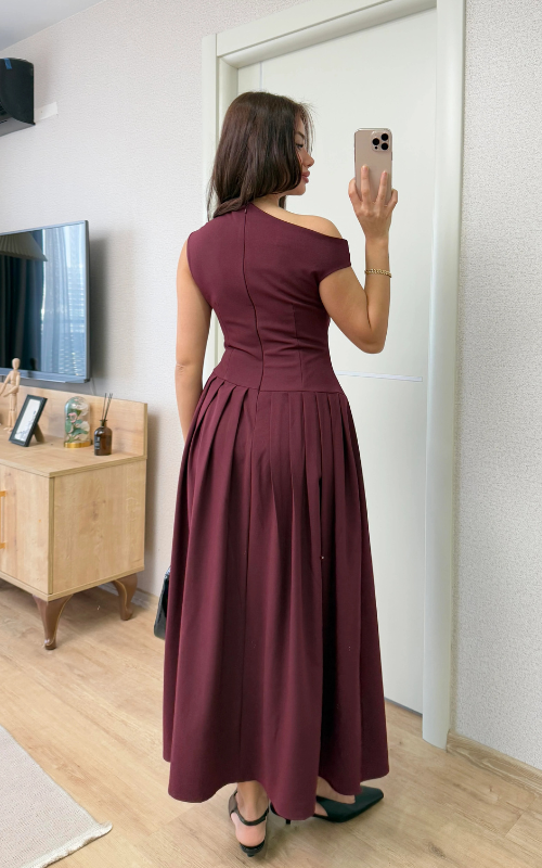 The Patricia Dress is a maxi dress featuring an asymmetric off-shoulder neckline, an angled waistline and elegant pleated detailing.