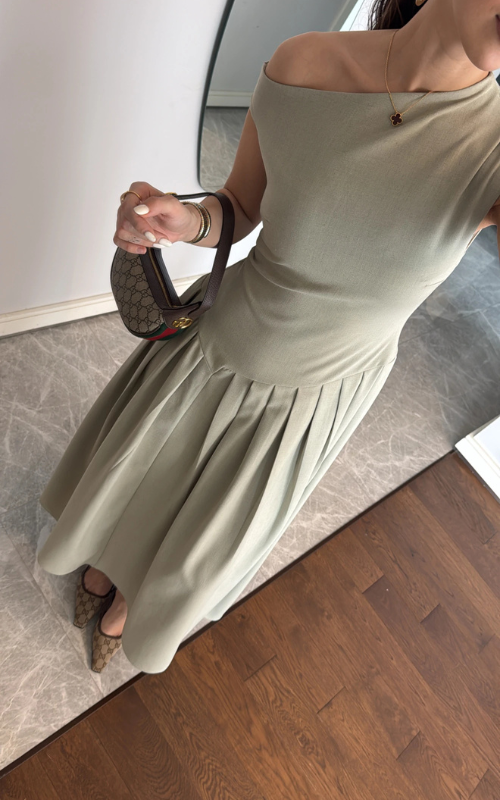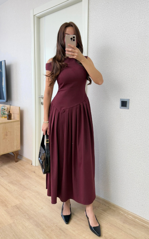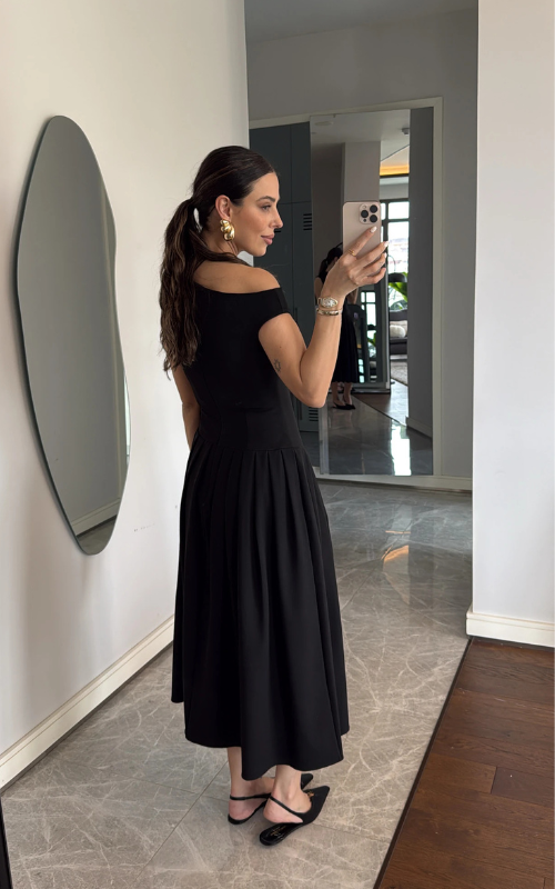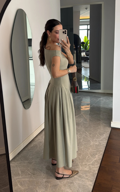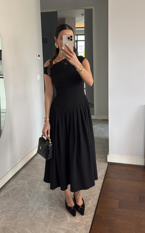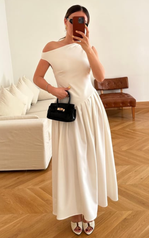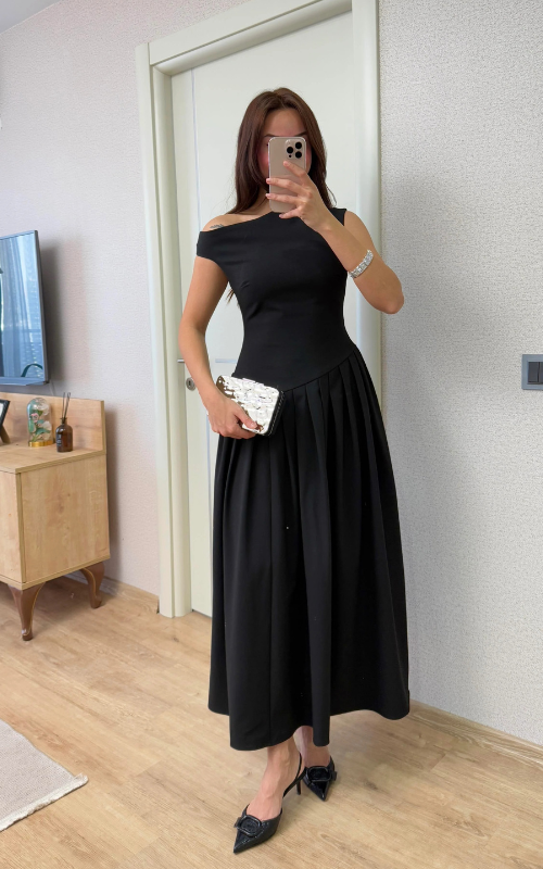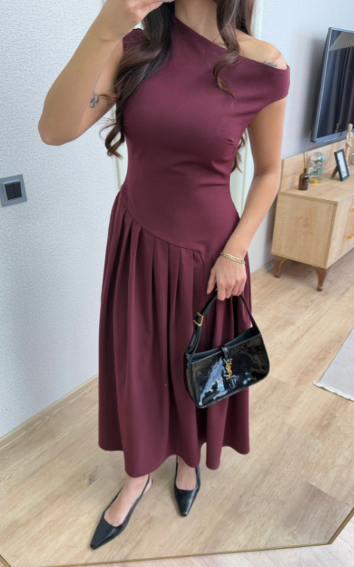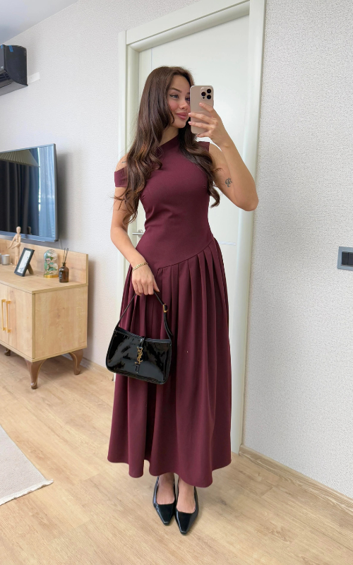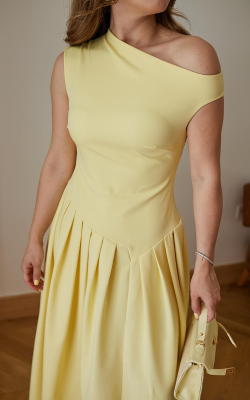 The Patricia Dress is a maxi dress featuring an asymmetric off-shoulder neckline, an angled waistline and elegant pleated detailing.