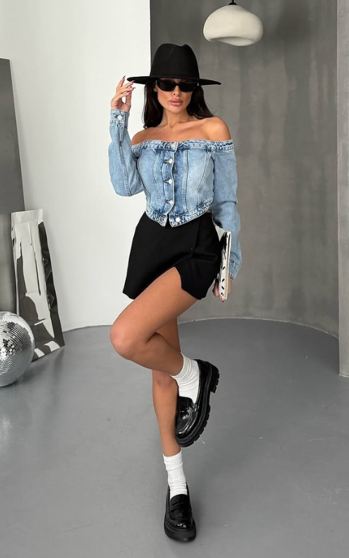 Stand out from the crowd with our Paula Top, crafted from denim fabric. Featuring long sleeves, an off-the-shoulder design, and a metal button front closure.