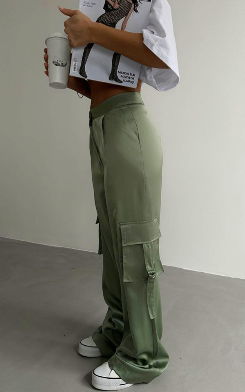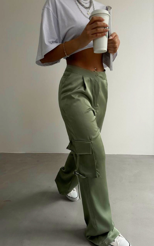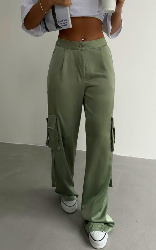 The Posh Style Pants feature a high-rise silhouette with button closure at the top, while the straight-cut legs feature cargo pockets with buckled straps at the sides.