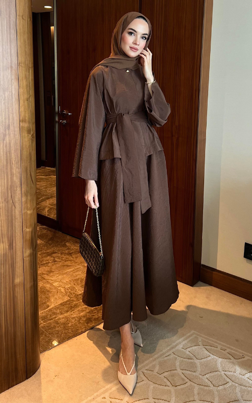 The Rania Set features a high collar top with a front button detail, flared sleeves, and a waist-cinching belt that adds a peplum-like silhouette while the long skirt flows gracefully to the floor.