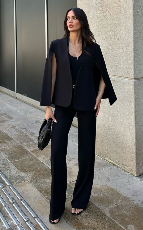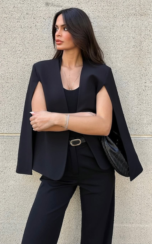 The Raven Blazer features dramatic split sleeves and an open front in a sleek cape style. Crafted from premium fabric, it delivers a bold, standout look.