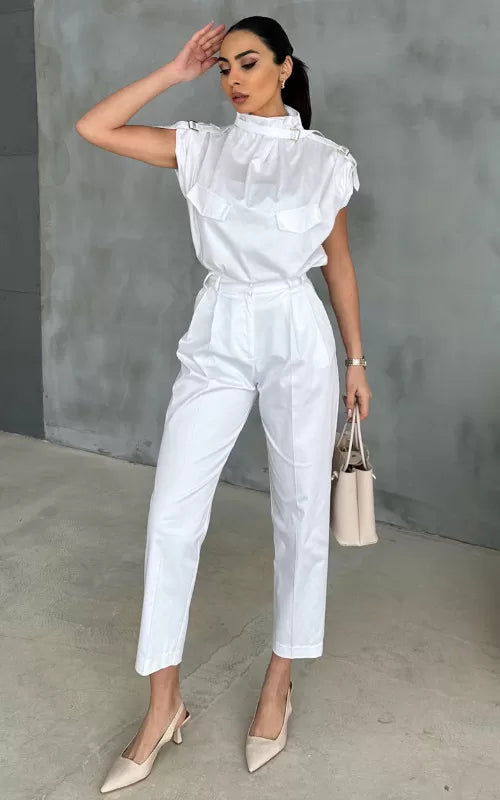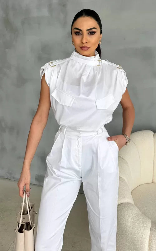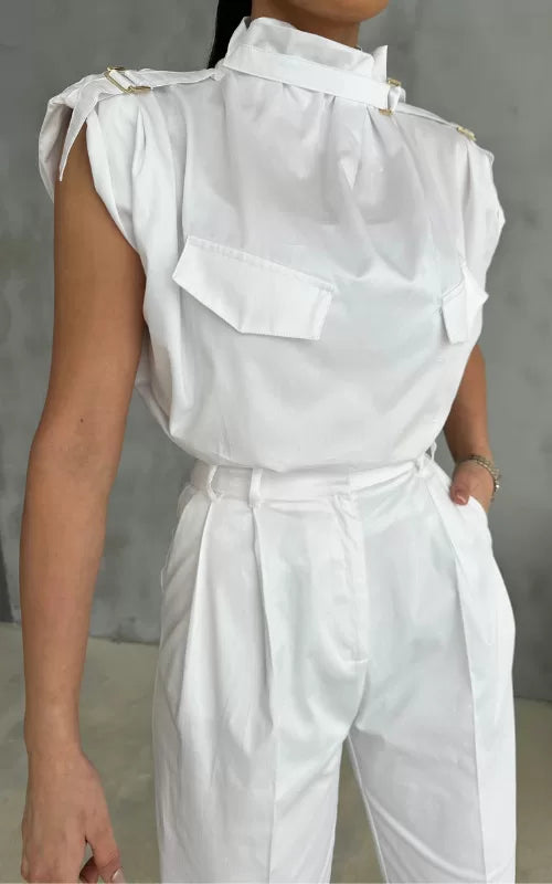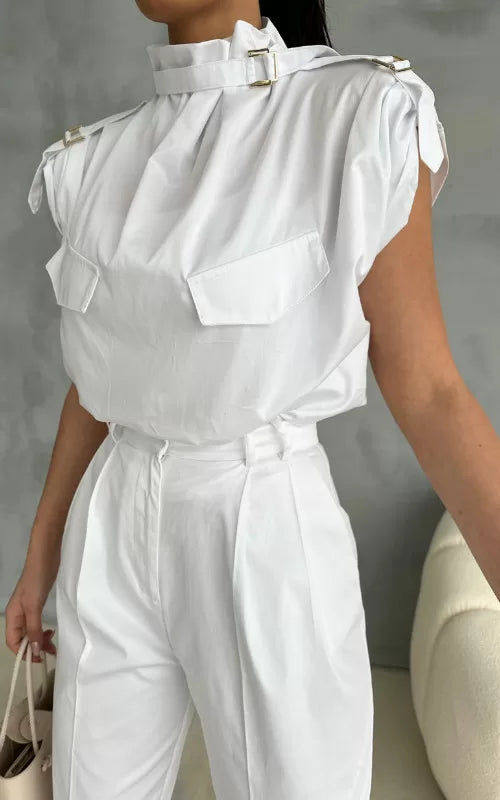 Crafted with precision and adorned with exquisite details, our Ritzy Top features a gathered and buckled turtleneck, chic faux pockets and buckled shoulder detail.