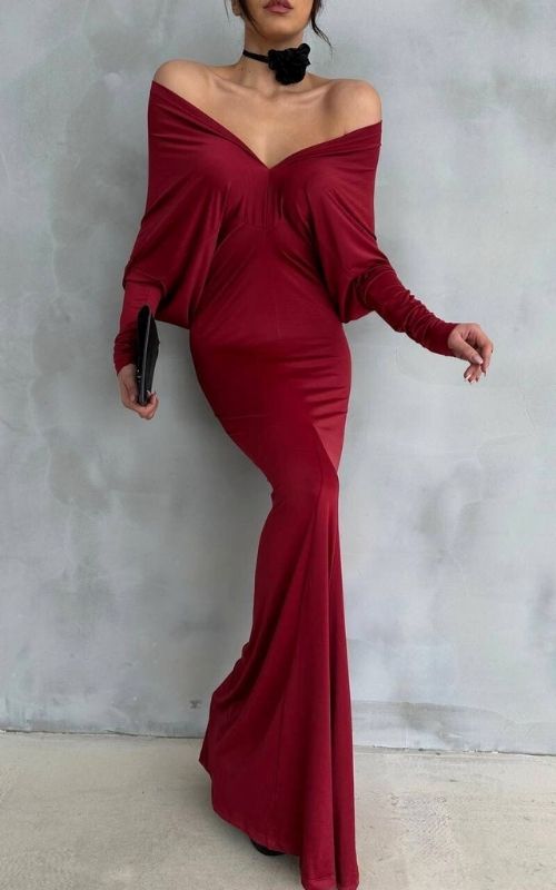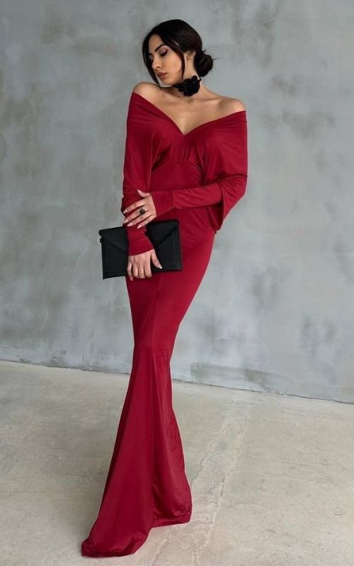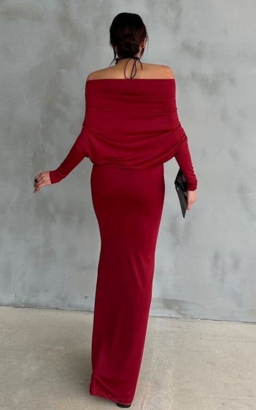 Exude feminine allure with our Ruby Dress. This body-hugging ensemble features a classic off-shoulder neckline, elegant long sleeves and form-fitting silhouette.
