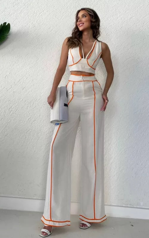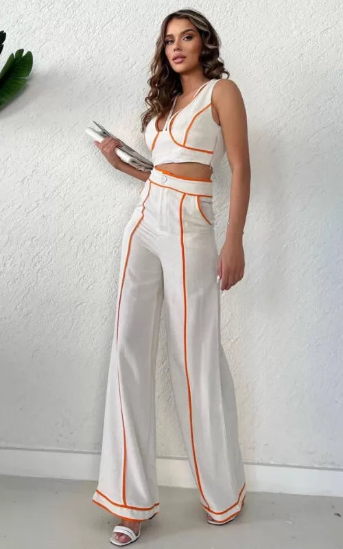 & Free ShippingCapture effortless style with our Safari Chic – a beige crop top and pant set adorned with orange stripes. Constructed from the finest linen, this duo offers a trending look with an airy, comfortable fit.
