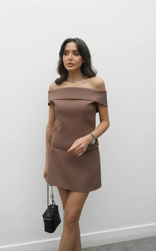 The Salma Set features a fold-over off-shoulder top made from stretchy fabric for a sleek fit, paired with a  mini skirt crafted from premium material.